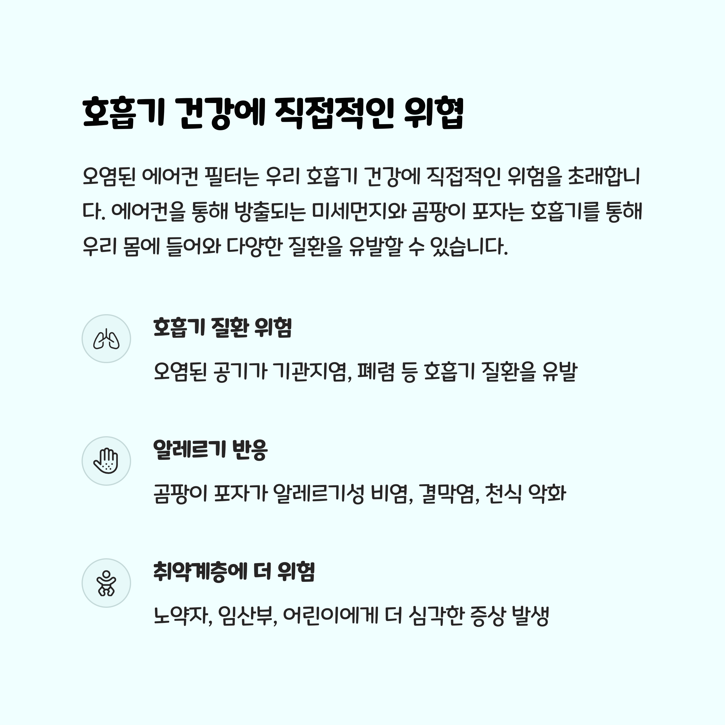 에어컨 필터가 오염되면 먼지, 곰팡이, 세균 등이 필터에 쌓여 실내로 재유입됩니다. 이로 인해 비염, 천식, 아토피 등 호흡기 질환이 악화될 수 있고, 알레르기 반응이나 목, 눈 따가움, 두통 등의 증상이 나타날 수 있습니다. 특히 어린이나 노약자, 면역력이 약한 사람에게 더 큰 건강 위협이 됩니다.