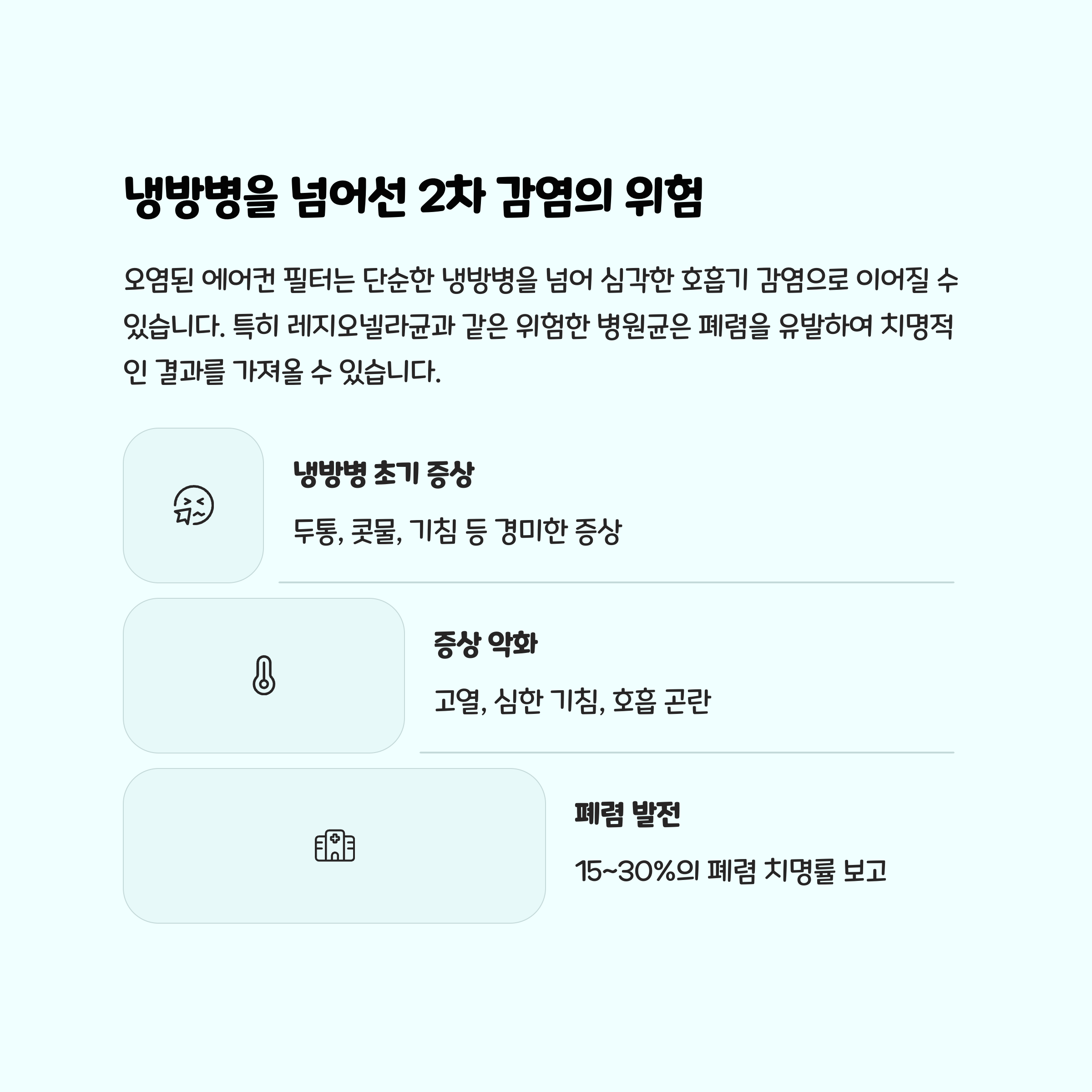 에어컨 표면에 번식한 세균이 실내로 확산되면, 식중독이나 감염병 위험도 커집니다. 실제로 한 고등학교에서는 에어컨 청소 불량으로 142명의 학생이 설사 증상으로 입원한 사례가 보고된 바 있습니다.