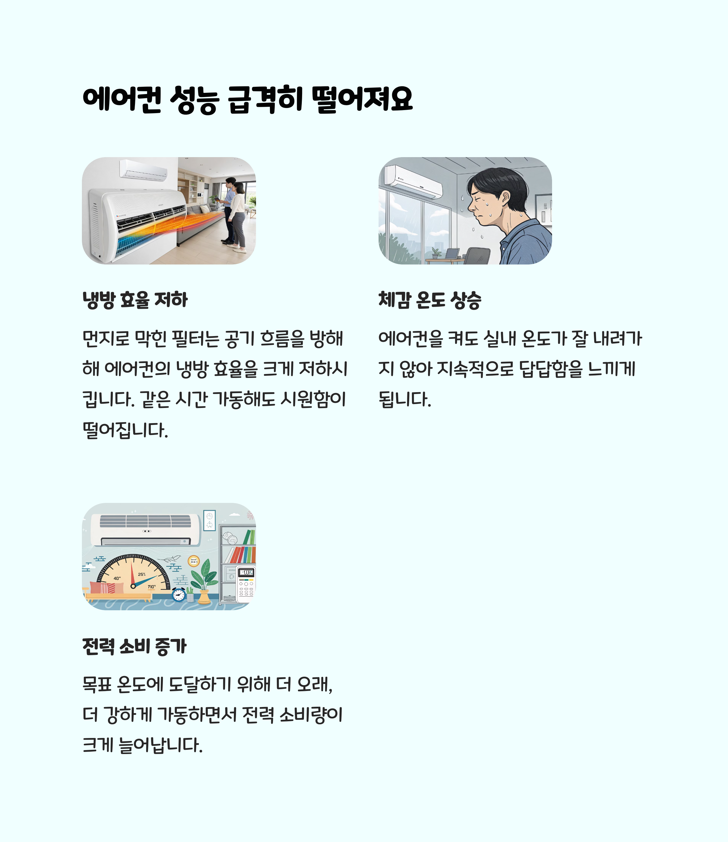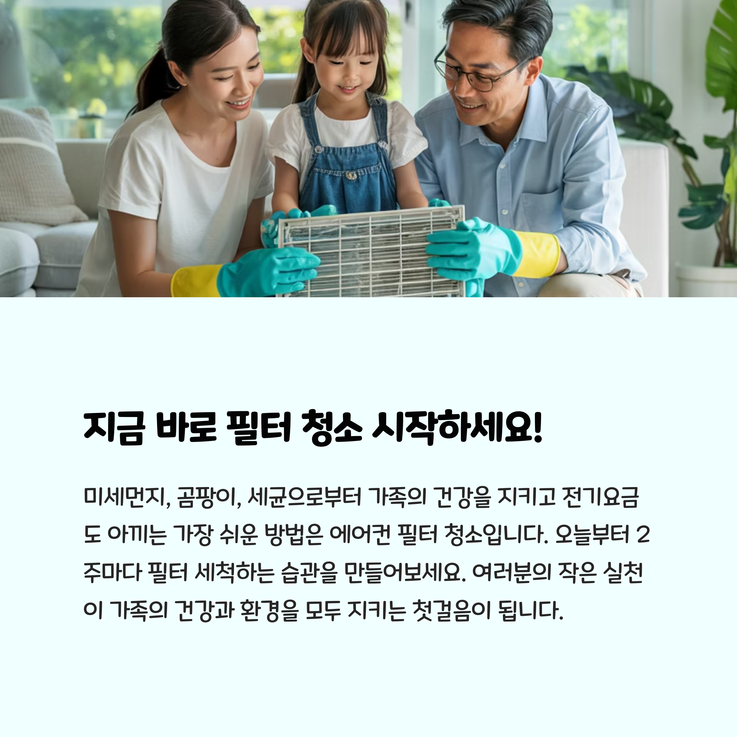 에어컨 필터 청소를 게을리하면 실내 공기 오염, 호흡기 질환, 전기요금 폭등, 에어컨 고장, 곰팡이·세균 번식 등 다양한 문제에 직면하게 됩니다. 2~4주에 한 번 필터를 꼼꼼히 청소하고, 1년에 한 번은 전문가 청소를 병행한다면 건강한 여름, 경제적인 에너지 소비, 그리고 오래가는 에어컨까지 모두 지킬 수 있습니다. 지금 바로 에어컨 필터를 점검하고, 쾌적하고 안전한 실내 환경을 만들어보세요!