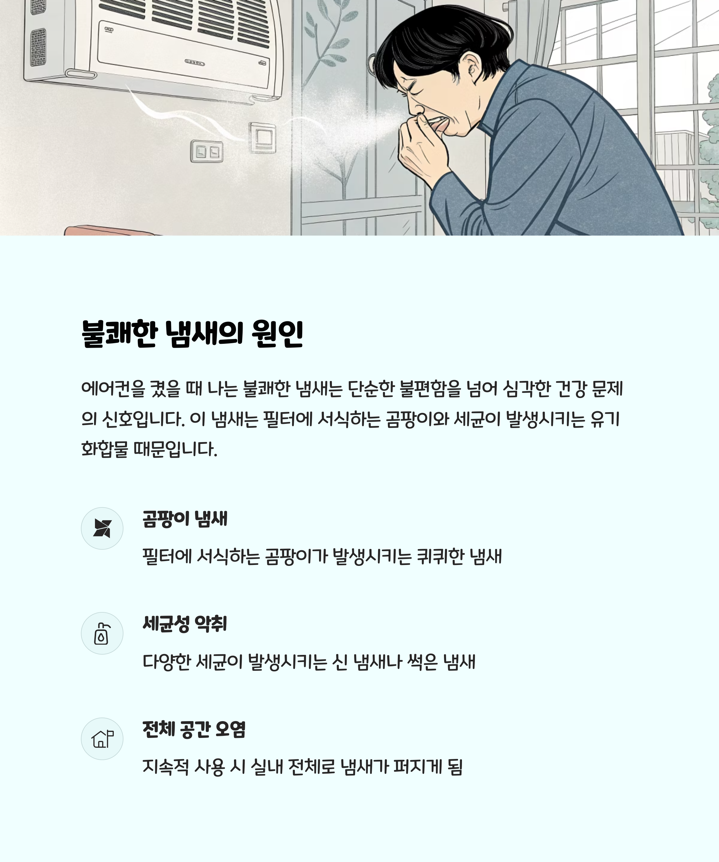 에어컨 내부는 습기가 많아 곰팡이와 세균이 번식하기 쉬운 환경입니다. 청소하지 않은 필터에는 카펫의 8배에 달하는 곰팡이가 서식할 수 있고, 오랜 기간 방치하면 곰팡이 냄새와 함께 각종 세균이 실내로 퍼집니다. 실제로 학교, 병원 등 공공시설 에어컨 냉각핀에서 알레르기 유발 곰팡이(클라도스포리움), 대장균, 살모넬라균이 다수 검출된 사례도 있습니다.