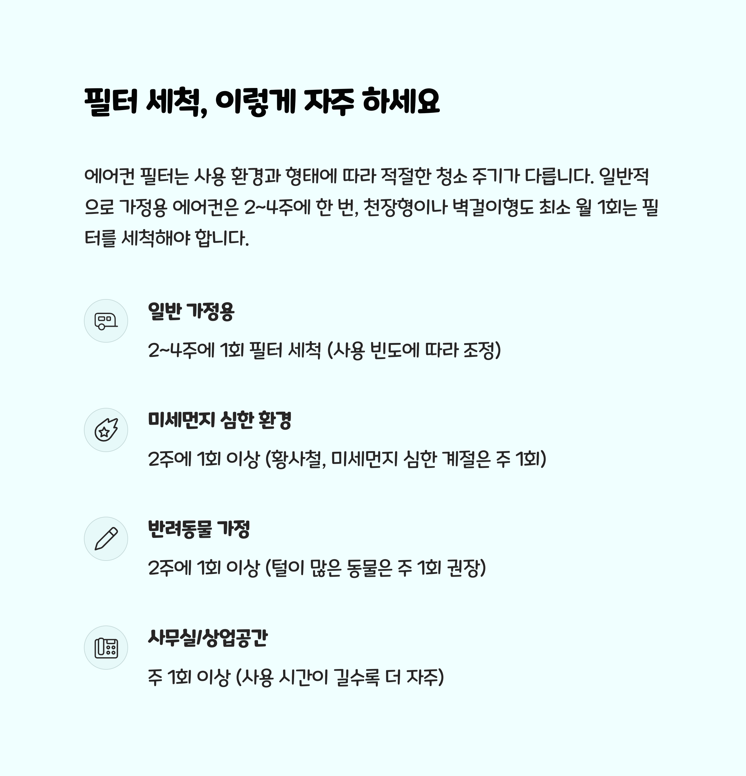 - 필터 청소 주기 : 일반적으로 2~4주에 한 번, 미세먼지나 황사가 심한 시기에는 1~2주에 한 번 청소하는 것이 좋습니다.