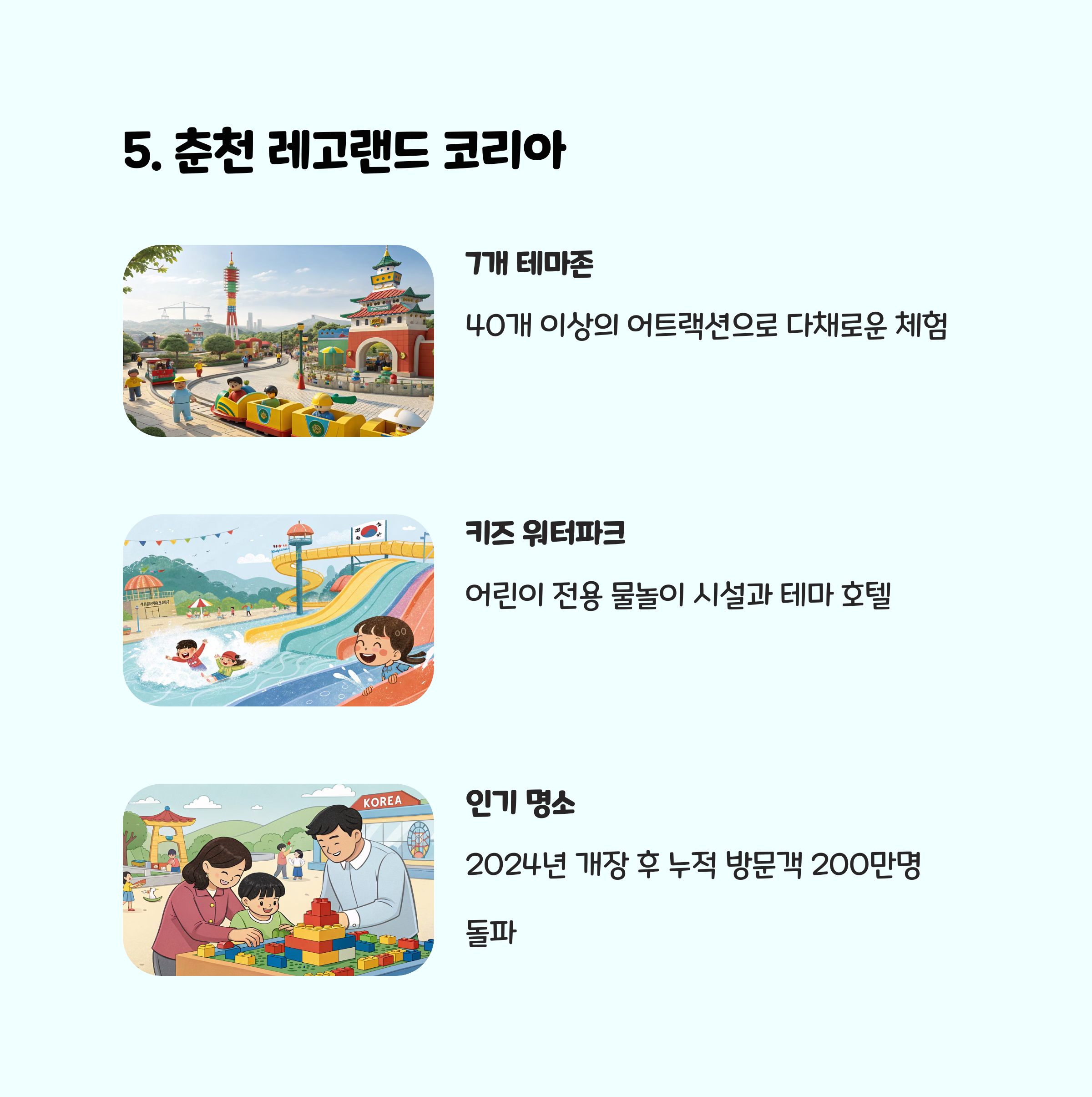 2022년 개장 이후 누적 방문객 300만 명을 돌파한 레고랜드 코리아는 만 2세~12세 어린이와 가족을 위한 어트랙션과 호텔이 결합된 테마파크입니다. 레고 모양의 놀이기구, 실내외 체험존, 가족형 숙소까지 모두 갖추고 있어 “아이들이 가장 가고 싶어 하는 여행지”로 손꼽힙니다.