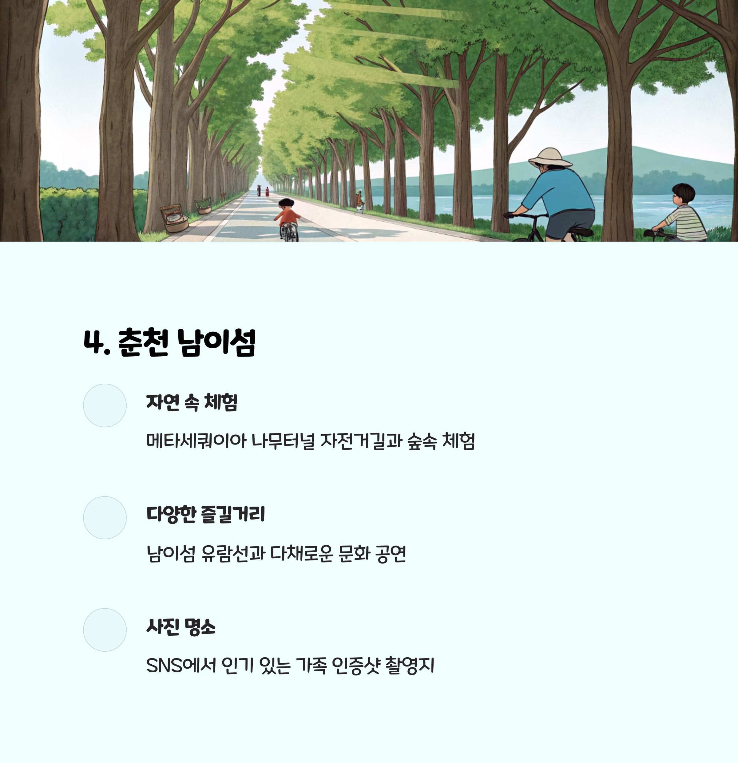 춘천 남이섬은 사계절 내내 아름답지만, 여름에는 특히 푸른 숲과 시원한 강바람이 매력적입니다. 메타세쿼이아 길, 자전거 대여, 유람선 등 다양한 체험이 가능하며, “아이와 함께 자연에서 뛰놀며 추억을 쌓기 좋은 곳”이라는 평가가 많습니다.