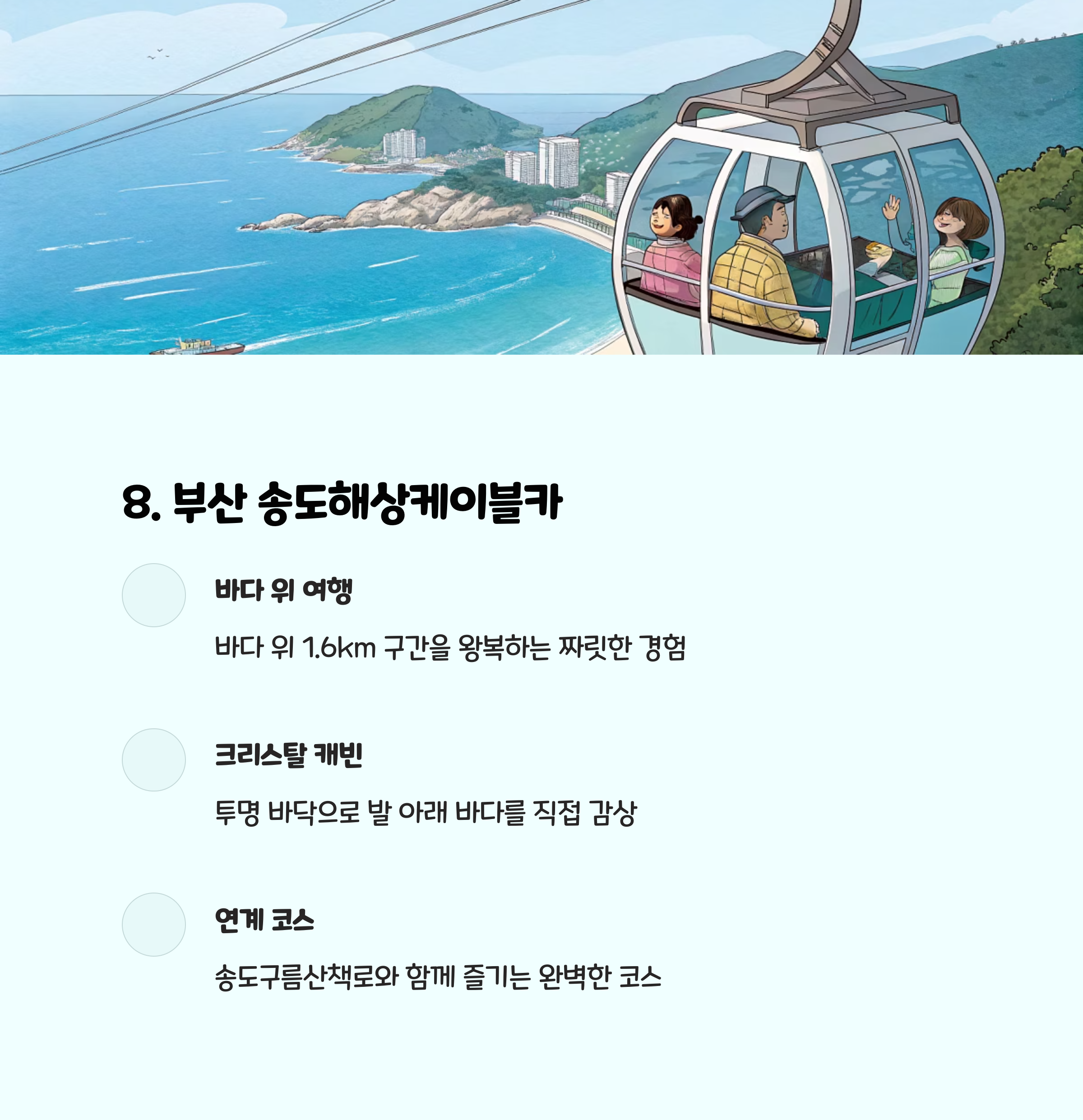 송도해상케이블카는 유리 바닥의 크리스탈 캐빈, 탁 트인 오션뷰, 용궁구름다리와 엑스 더 스카이 전망대 등 다양한 볼거리가 함께 있어 가족 단위 방문객이 많습니다. “아이들이 바다 위를 건너는 특별한 경험에 크게 감탄한다”는 후기가 많습니다.