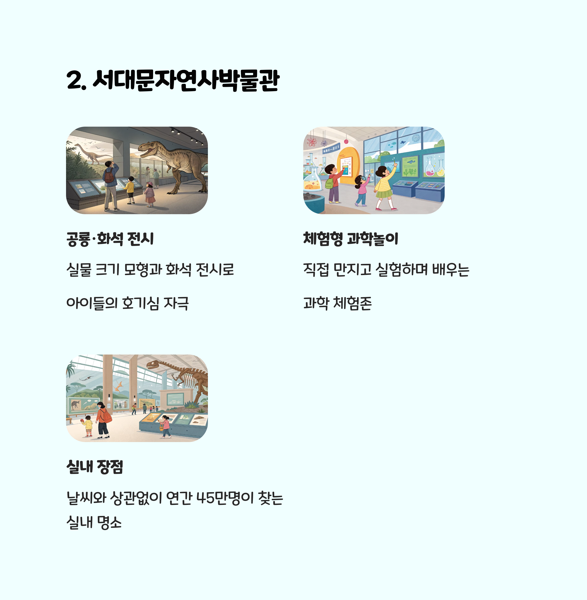 서대문자연사박물관은 실내 전시로 더운 날씨에도 쾌적하게 관람할 수 있습니다. 대형 공룡 모형, 생명진화관, 지구환경관 등 다양한 테마관이 있어 교육 효과도 뛰어납니다. 2024년 기준 연간 방문객 수는 약 35만 명에 달하며, “아이들이 직접 만지고 체험할 수 있는 전시가 많아 가족 단위 방문객이 꾸준히 늘고 있다”는 후기가 많습니다.