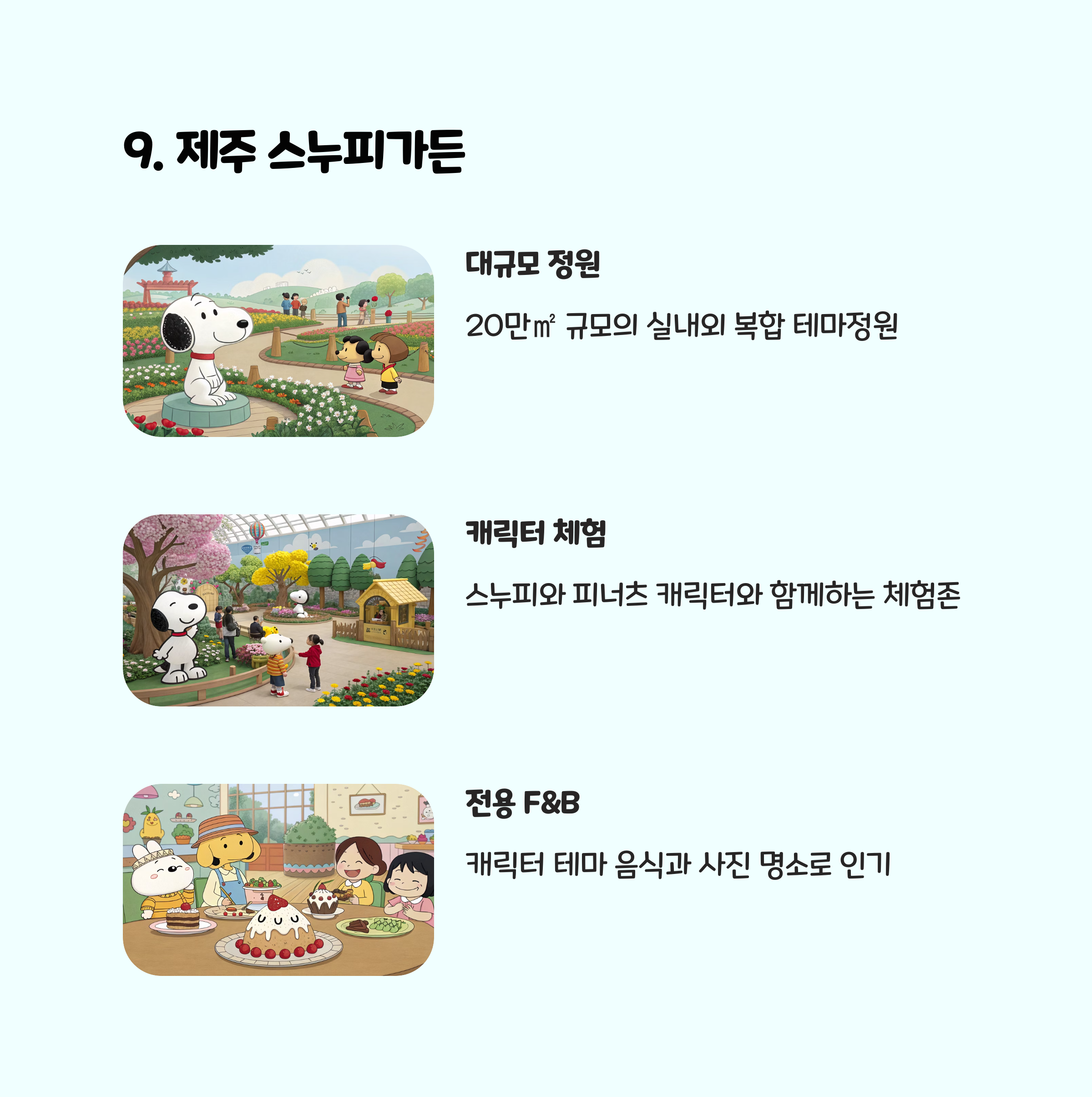 제주도의 스누피가든은 실내외 전시관, 야외 정원, 다양한 포토존과 체험 프로그램이 결합된 복합 공간입니다. “아이와 함께 사진 찍고, 캐릭터 체험을 하며 하루 종일 즐길 수 있다”는 평이 많아 가족여행지로 인기가 높습니다.