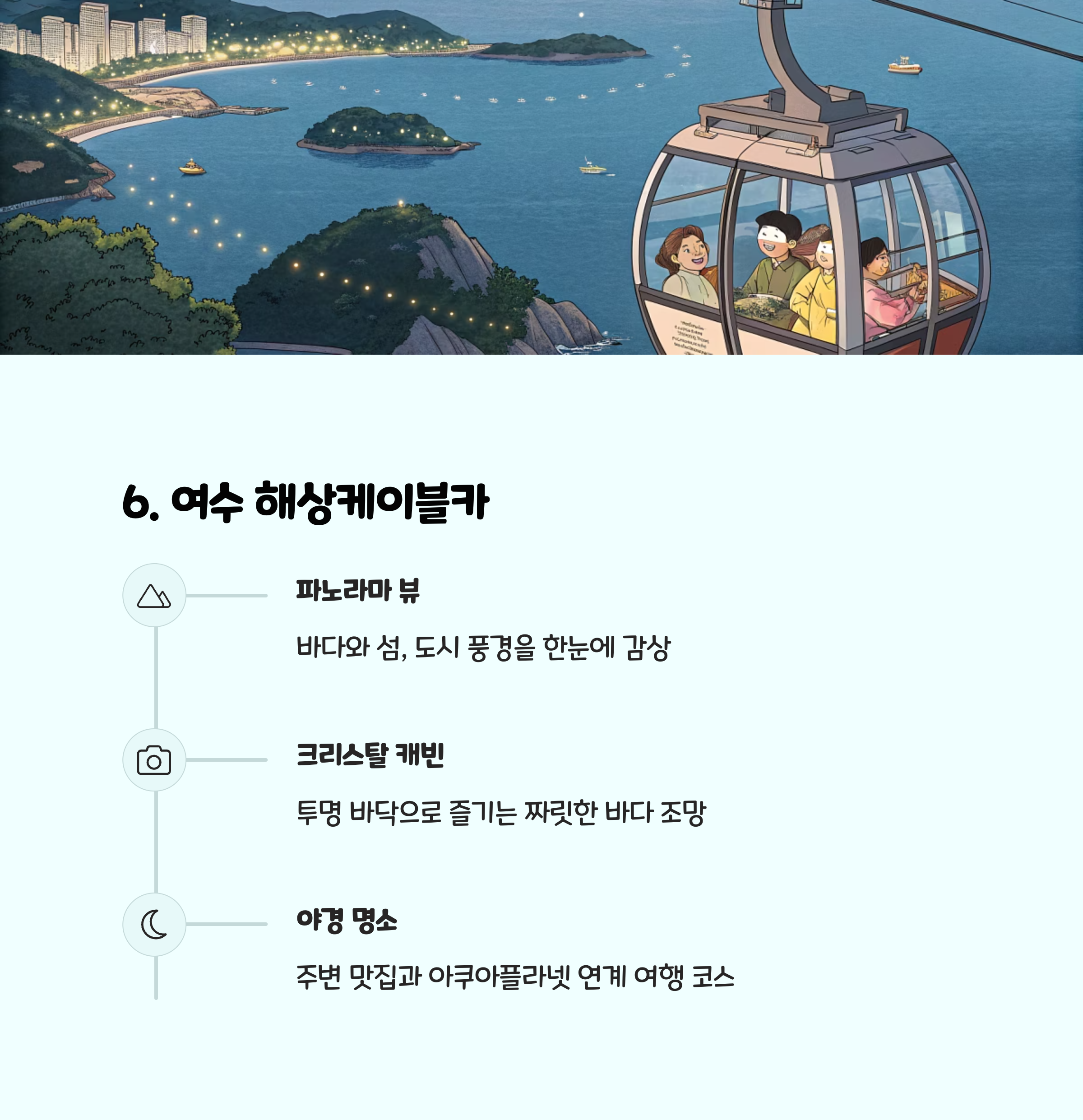 여수 해상케이블카는 연간 200만 명 이상이 이용하는 인기 명소입니다. 바다와 도시의 경관을 한눈에 감상할 수 있고, 근처에 아쿠아플라넷, 오동도 등 다양한 관광지가 밀집해 있어 가족 여행 코스로 최적입니다.