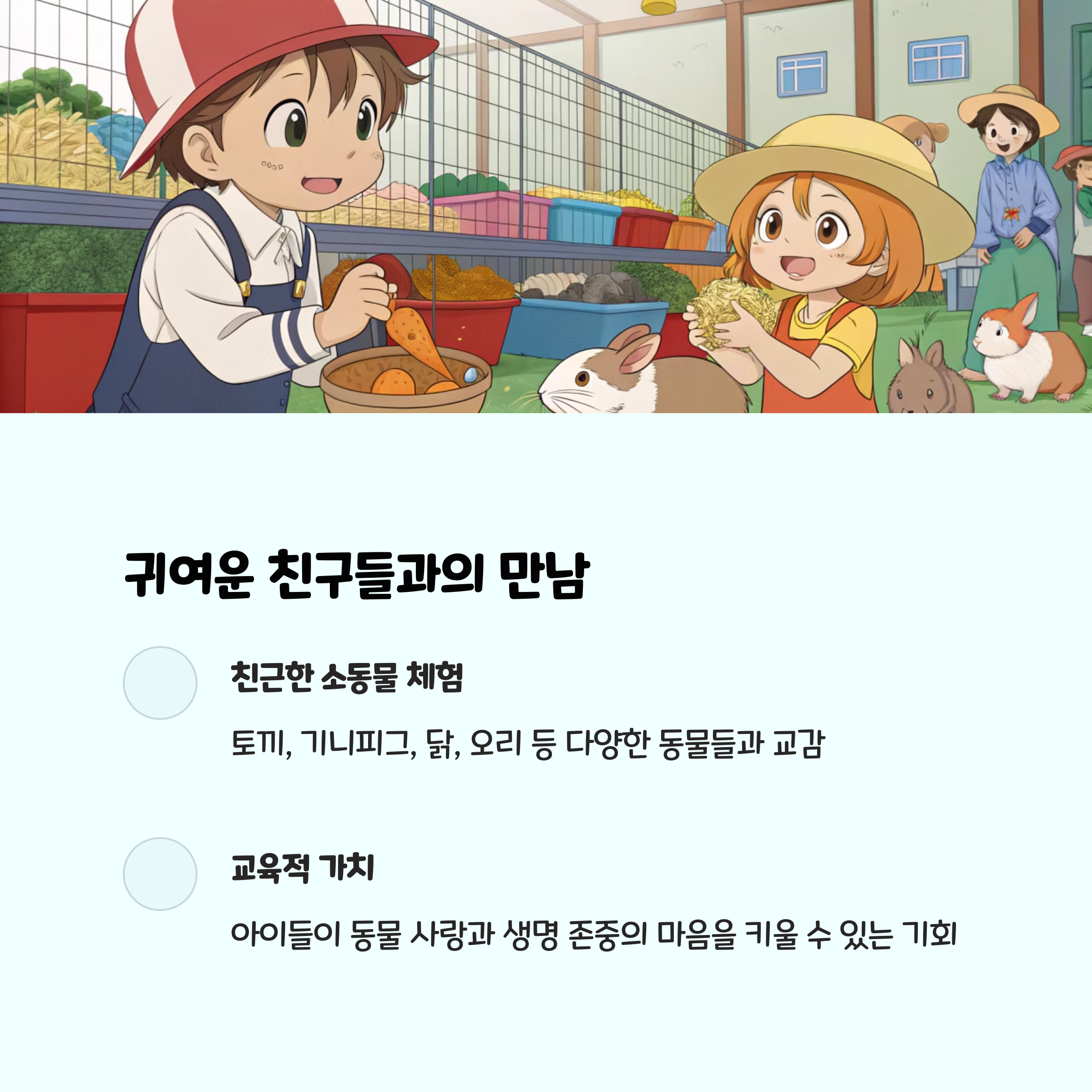 이곳의 가장 큰 매력은 아이들이 직접 동물에게 먹이를 주고, 가까이에서 교감할 수 있다는 점입니다. 토끼, 기니피그, 염소, 양, 앵무새 등 다양한 동물들이 있어 도심에서 쉽게 접할 수 없는 체험을 제공합니다. 기본 입장료에 채소 먹이가 포함되어 있어, 아이들이 자연스럽게 동물과 소통할 수 있습니다. 추가로 이색적인 먹이도 현장에서 구매할 수 있어, 더욱 다채로운 경험이 가능합니다.