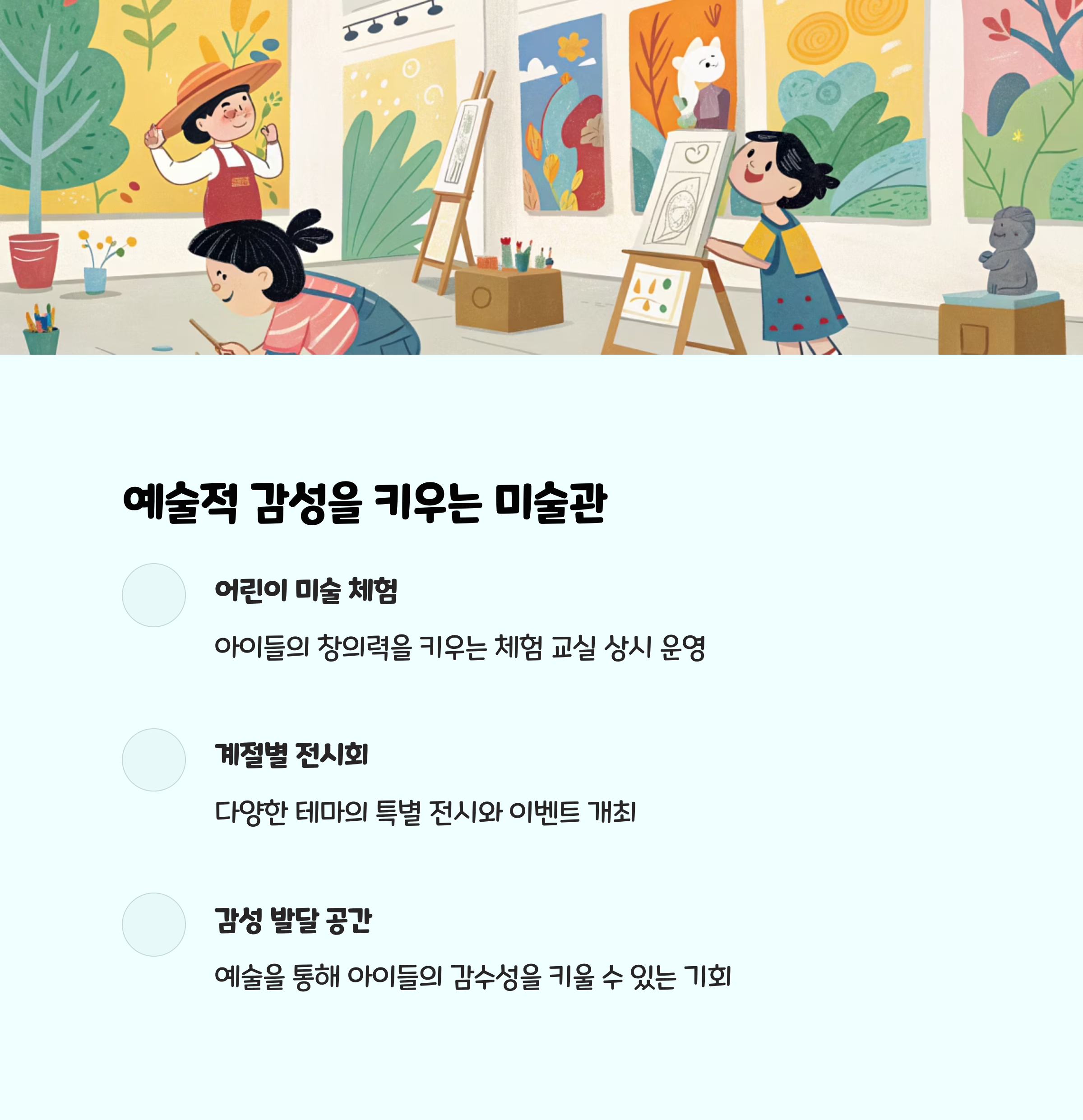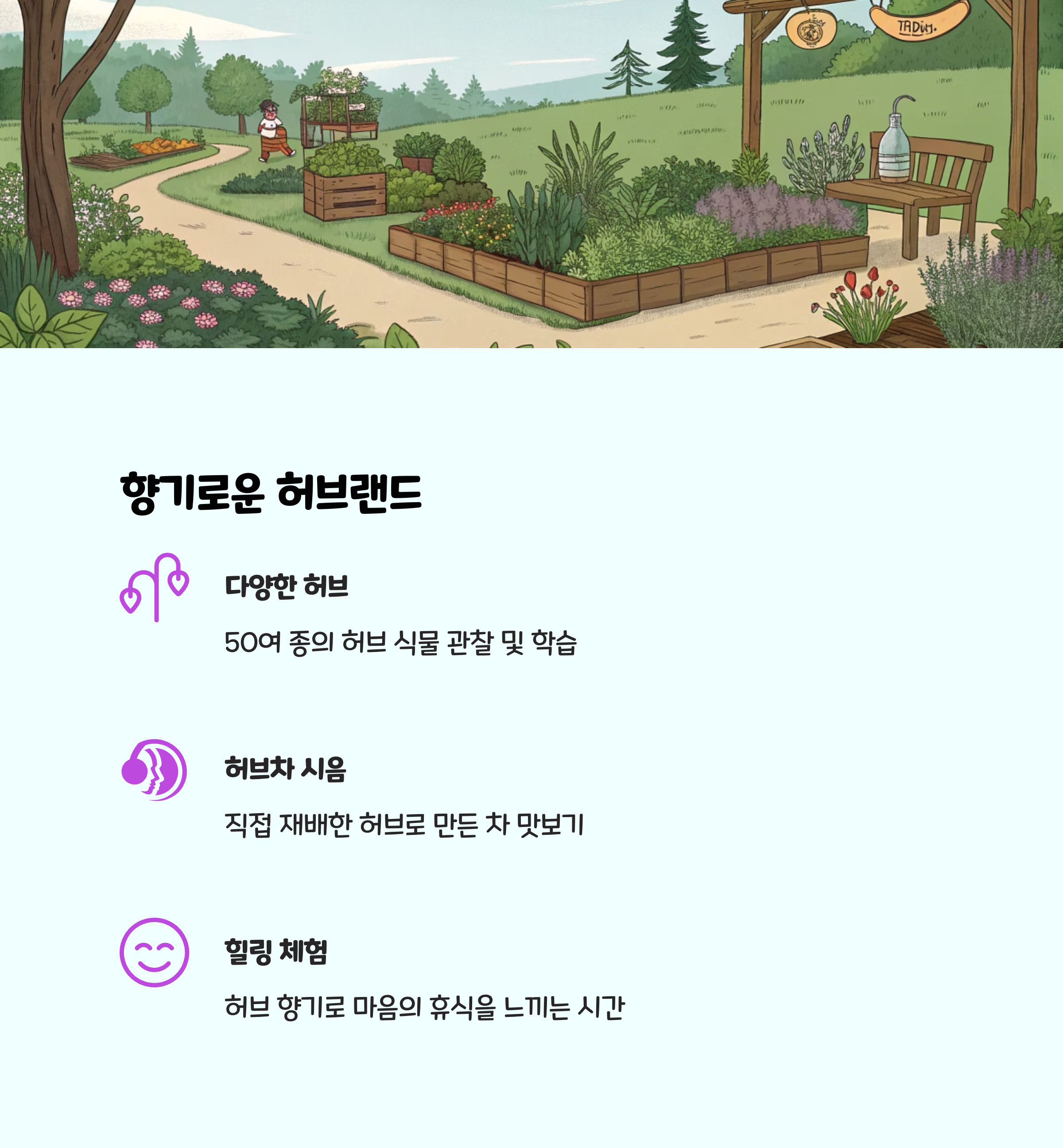 동물 체험 외에도 넓은 자연 속에서 산책을 하거나, 미술관과 허브랜드에서 예술과 자연을 함께 느낄 수 있어 가족 모두가 만족할 수 있는 여행지입니다.