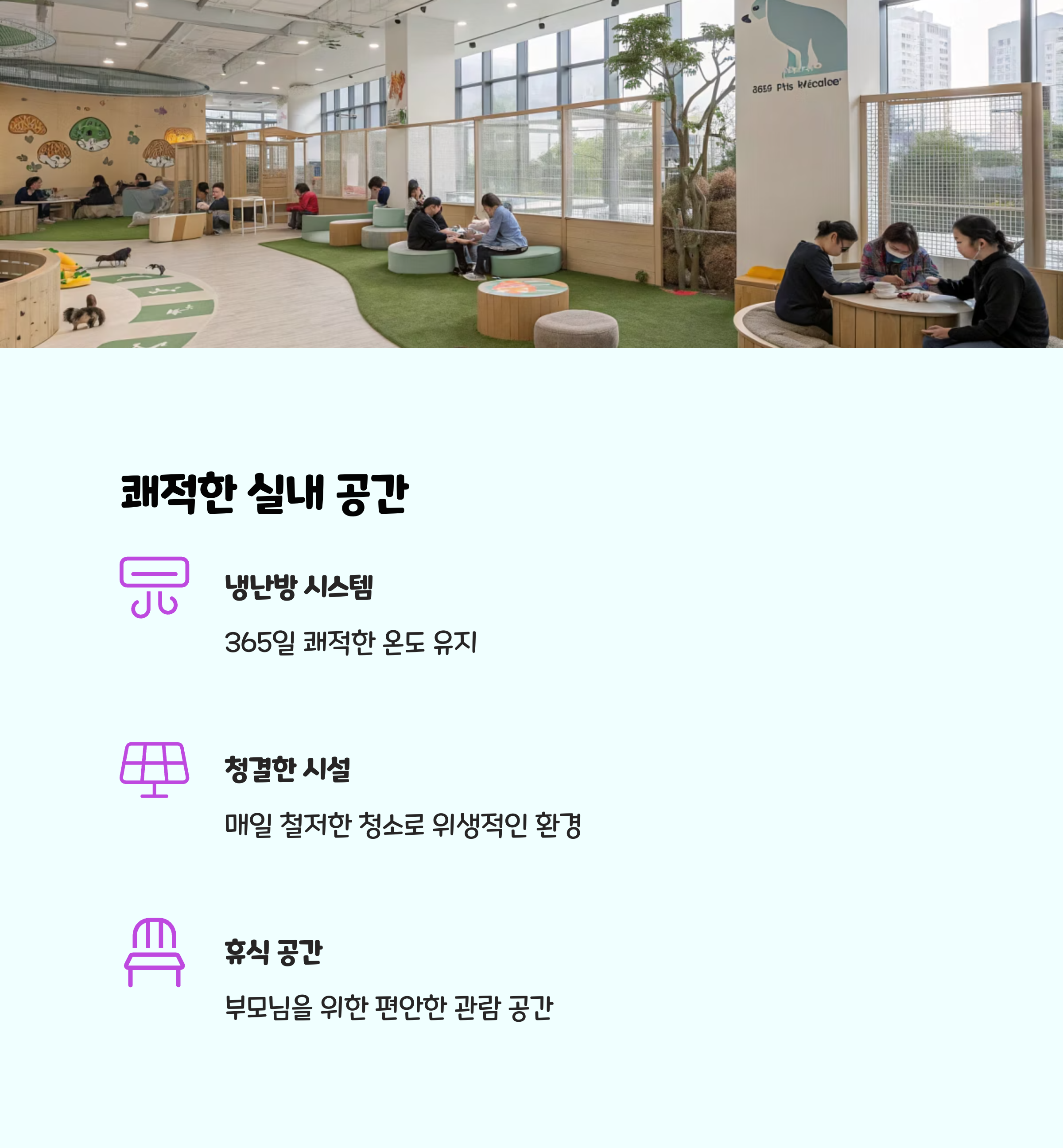 바둑이네 동물원은 실내외 공간이 분리되어 있어, 여름철 무더위나 우천 시에도 쾌적하게 방문할 수 있습니다. 관리가 잘 된 동물 우리와 체험 공간, 그리고 직원의 안내로 아이들이 안전하게 동물과 교감할 수 있습니다. 특히, 실내 공간은 유모차 이동이 편리하도록 설계되어 있어 어린 자녀를 둔 가족도 부담 없이 방문할 수 있습니다.