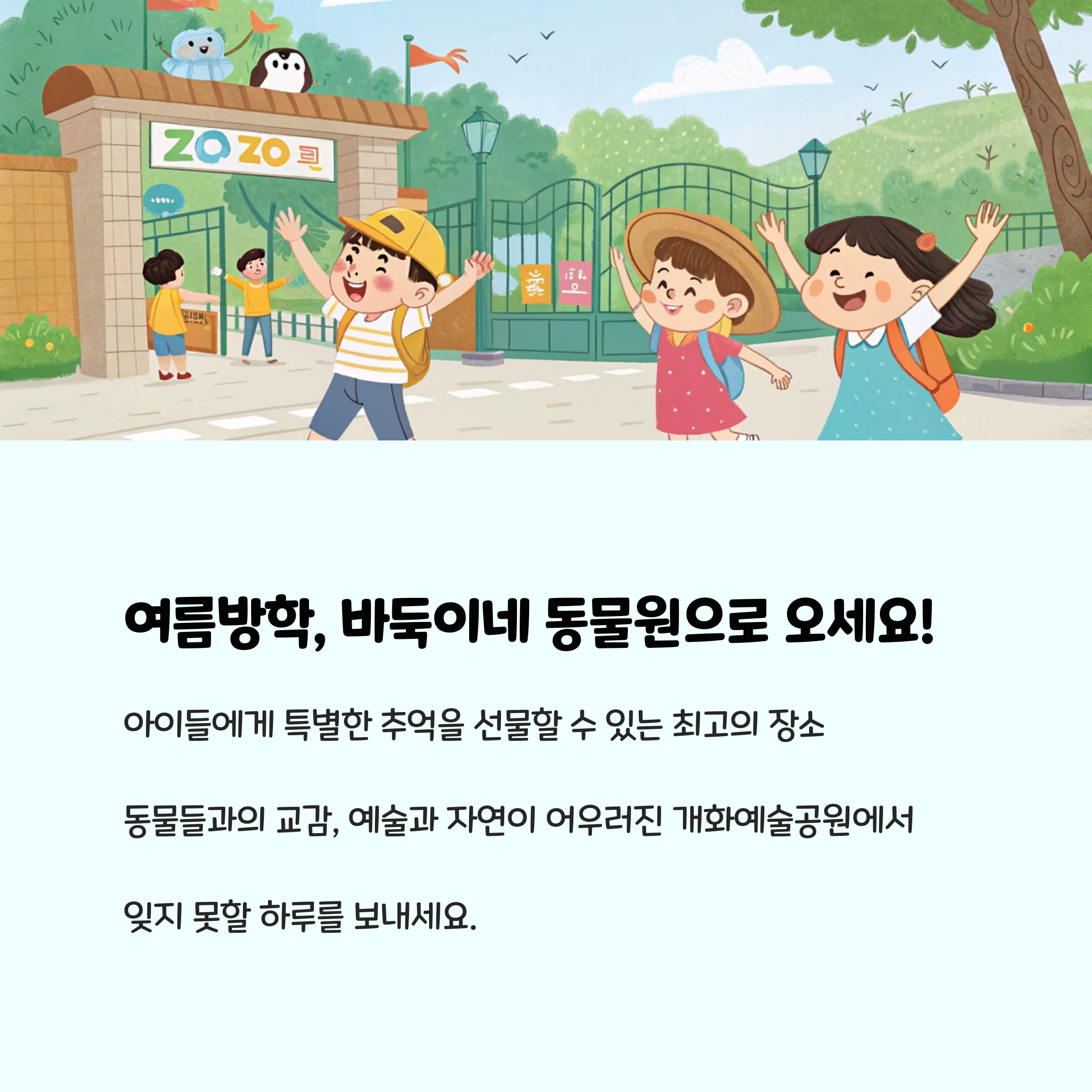 여름방학, 아이와 함께 실내에서 안전하고 특별한 동물 체험을 원한다면 충남 보령 개화예술공원 내 바둑이네 동물원이 탁월한 선택입니다. 직접 동물에게 먹이를 주고, 자연과 예술이 어우러진 공간에서 하루를 보내며, 아이의 호기심과 감성을 모두 충족시킬 수 있는 이곳에서 올여름, 잊지 못할 추억을 만들어보세요.