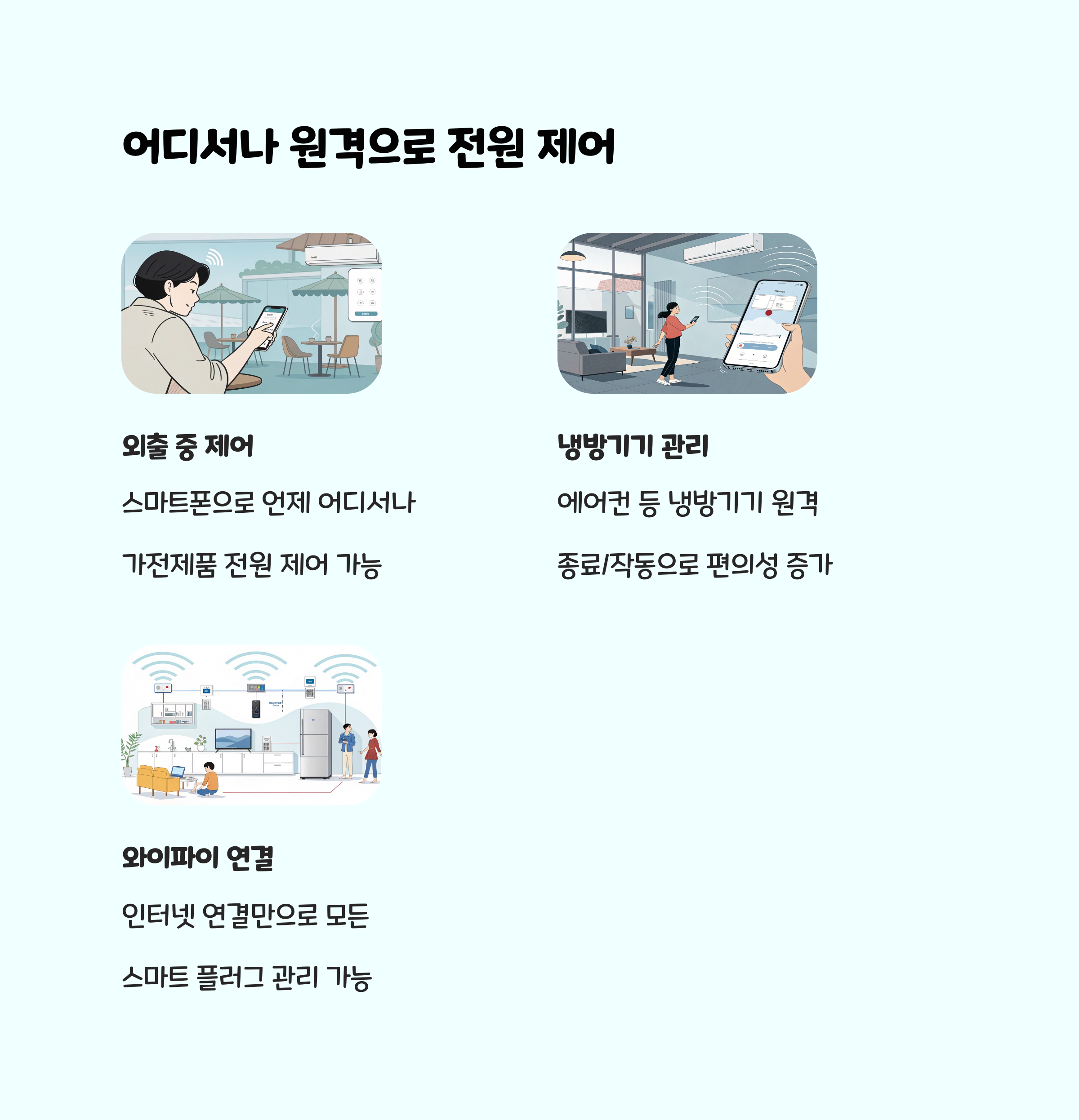 스마트폰 GPS 또는 네트워크 기반 자동화 기능을 활용해, 집을 비우면 자동으로 주요 가전의 전원을 차단할 수 있습니다. 1인 가구나 맞벌이 가정에 특히 유용합니다.