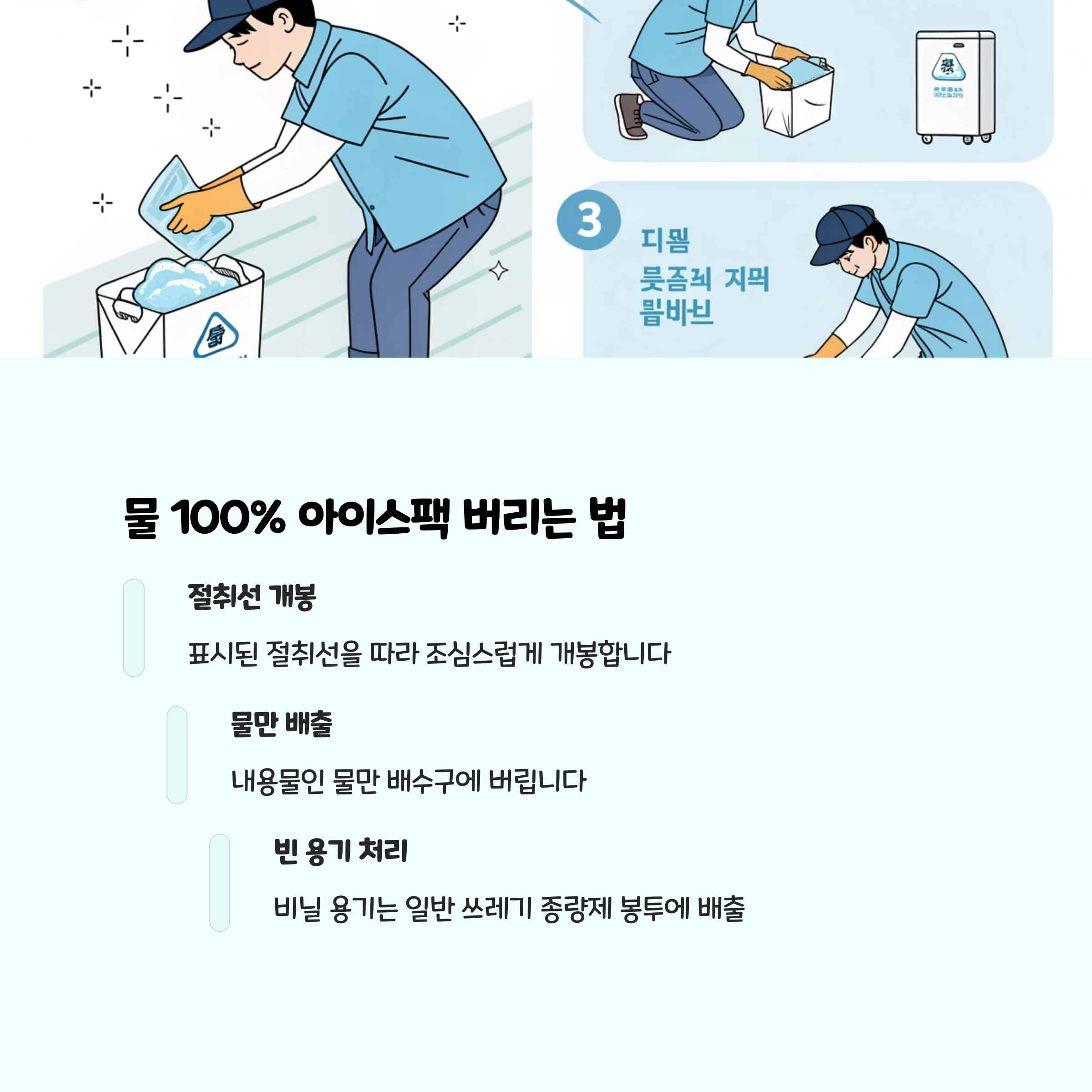 - 겔형 아이스팩: 겉 비닐을 잘라 비닐은 비닐류로, 젤은 신문지나 키친타월에 흡수시켜 말린 뒤 종량제 봉투에 버립니다. 하수구나 변기에 절대 버리지 마세요.