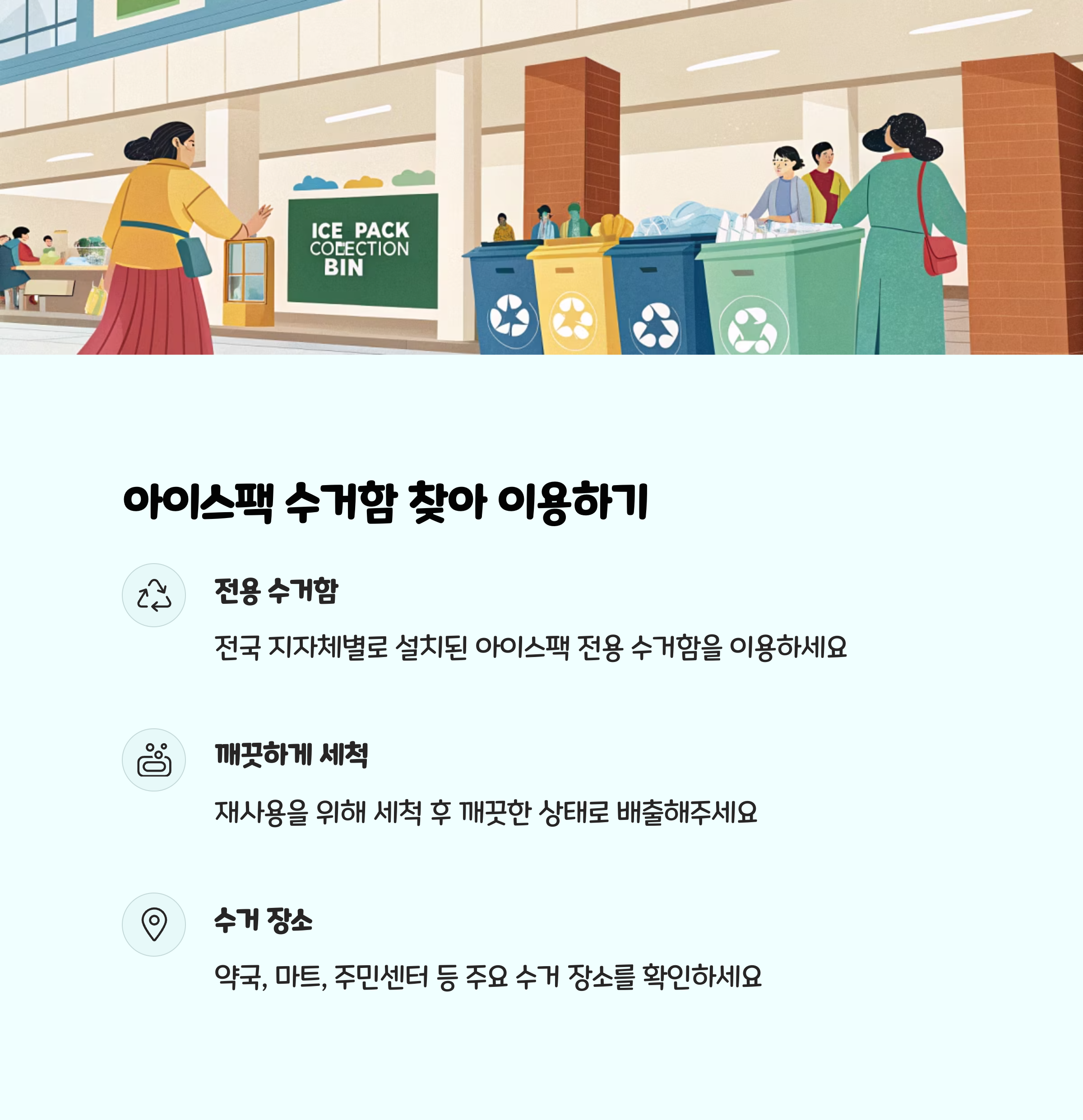 - 장기 보관 시: 아이스팩이 너무 많아지면 지역 커뮤니티, 복지센터, 주민센터 등에서 운영하는 아이스팩 수거함을 활용하는 것도 좋은 방법입니다. 서울시와 여러 지자체에서는 수거함을 설치해 재활용률을 높이고 있습니다.