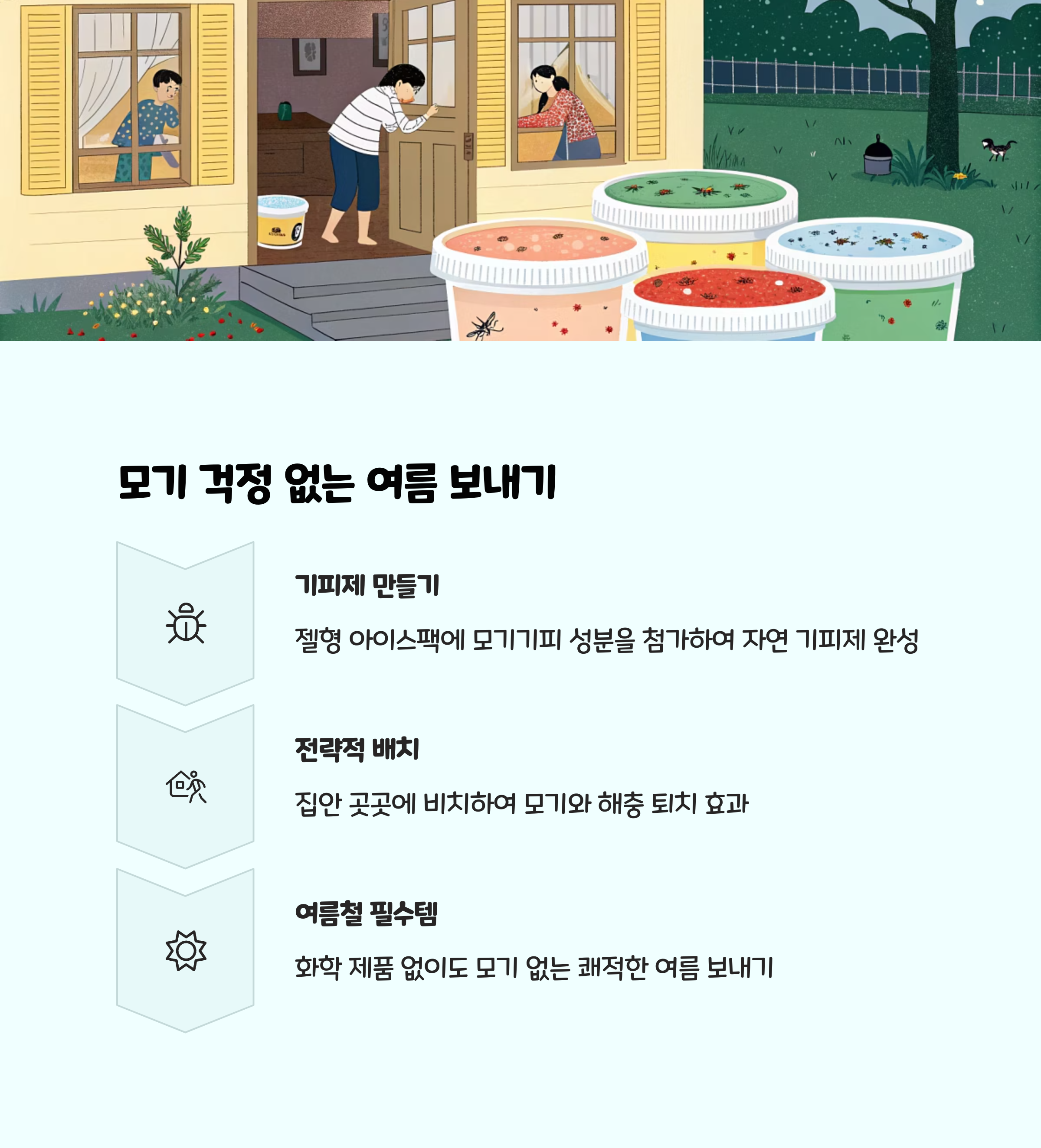 아이스팩 속 젤은 냄새와 수분을 잘 흡수합니다. 해동한 아이스팩을 병에 담고 에센셜 오일이나 향수를 10~20방울 떨어뜨리면 간편한 방향제, 탈취제가 완성됩니다. 레몬그라스, 시트로넬라, 티트리 등 모기가 싫어하는 향을 첨가하면 여름철 모기 기피제로도 쓸 수 있습니다.