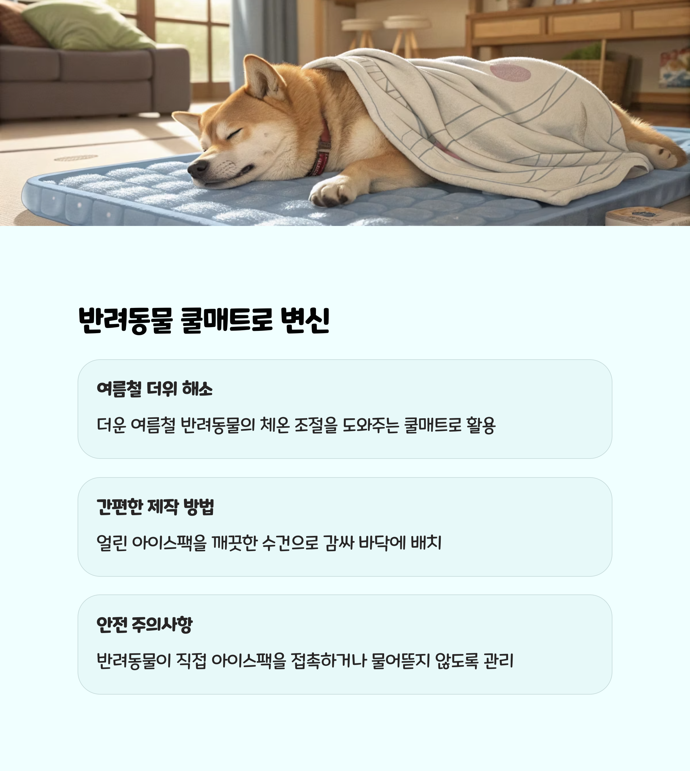 여름철 더위에 지친 반려동물에게 아이스팩을 타월에 싸서 방석 아래에 깔아주면 간단한 쿨방석이 됩니다. 직접 닿지 않게 주의하세요.
