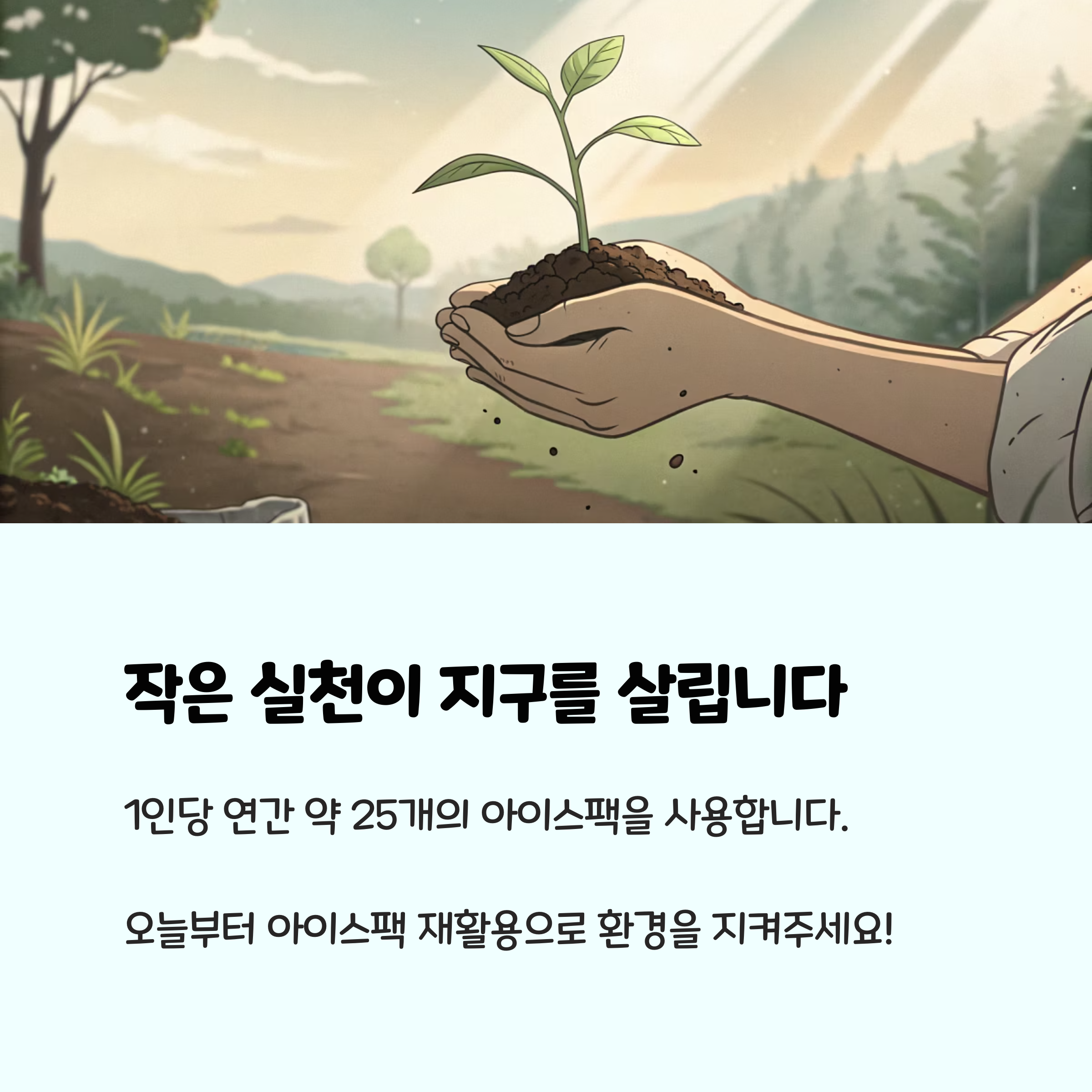 집에 아이스팩이 너무 많아지면 지역 주민센터, 복지관, 아파트 단지 등에 설치된 아이스팩 수거함을 활용하세요. 수거된 아이스팩은 세척·소독 후 전통시장, 마트 등에서 재사용되어 자원 순환에 도움이 됩니다.