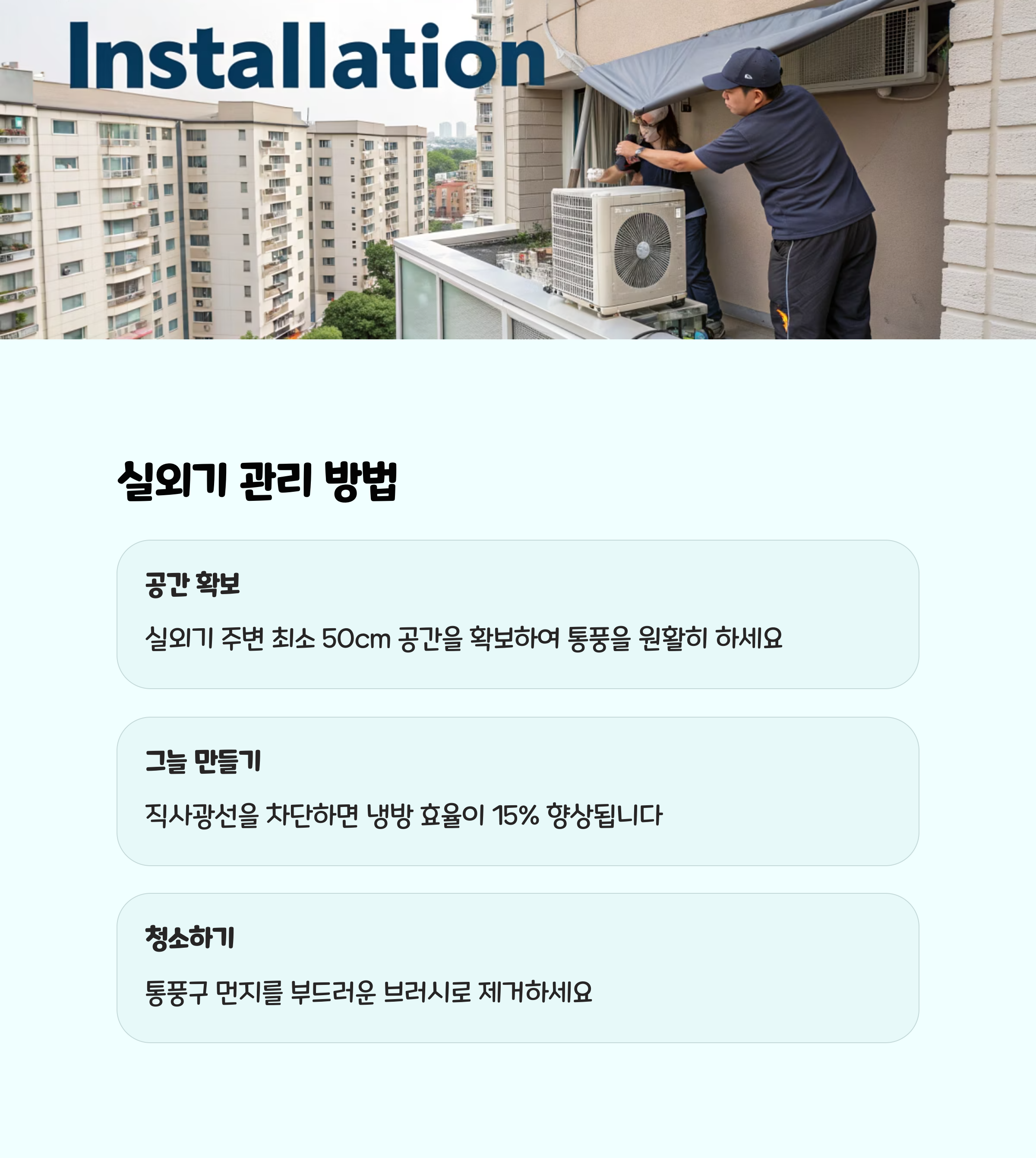 | 실외기 점검 | 1개월 | 주변 장애물 제거, 팬 회전, 배수관 상태, 표면 청소 |