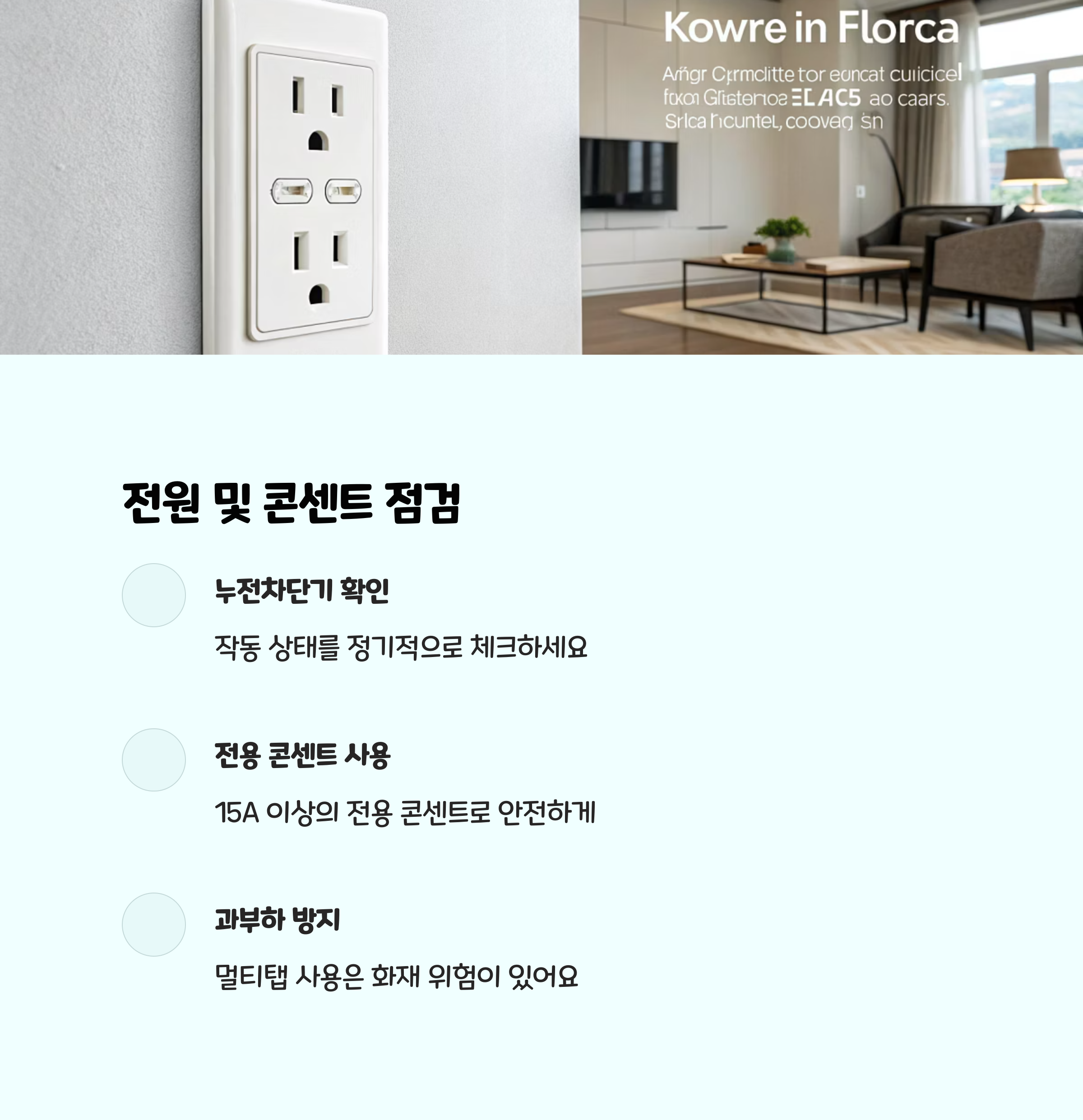 전원 코드와 콘센트 연결 상태를 반드시 확인하세요. 느슨한 연결이나 손상된 전선은 화재 위험의 주요 원인입니다. 에어컨 전용 차단기가 정상적으로 작동하는지 점검하고, 전원 연결 신호음이 들리는지 확인하세요. 리모컨 배터리도 함께 점검해 주세요. 신호 전송이 원활하지 않으면 배터리 교체가 필요합니다.