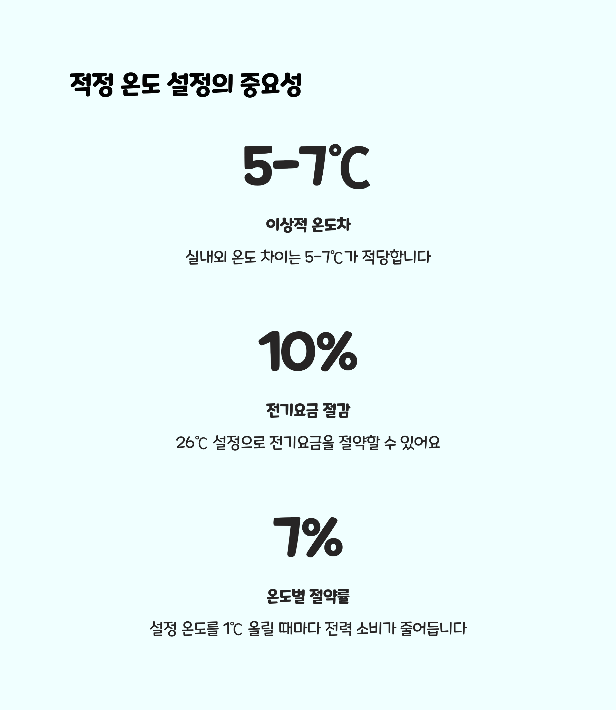 실내외 온도차는 5°C 이내로 유지하는 것이 에어컨 수명과 전기요금 절감에 효과적입니다. 에어컨을 끄기 전에는 ‘송풍’ 또는 ‘자동건조’ 기능을 10분 이상 작동시켜 내부 습기를 완전히 제거하세요. 곰팡이와 악취 예방에 필수입니다.