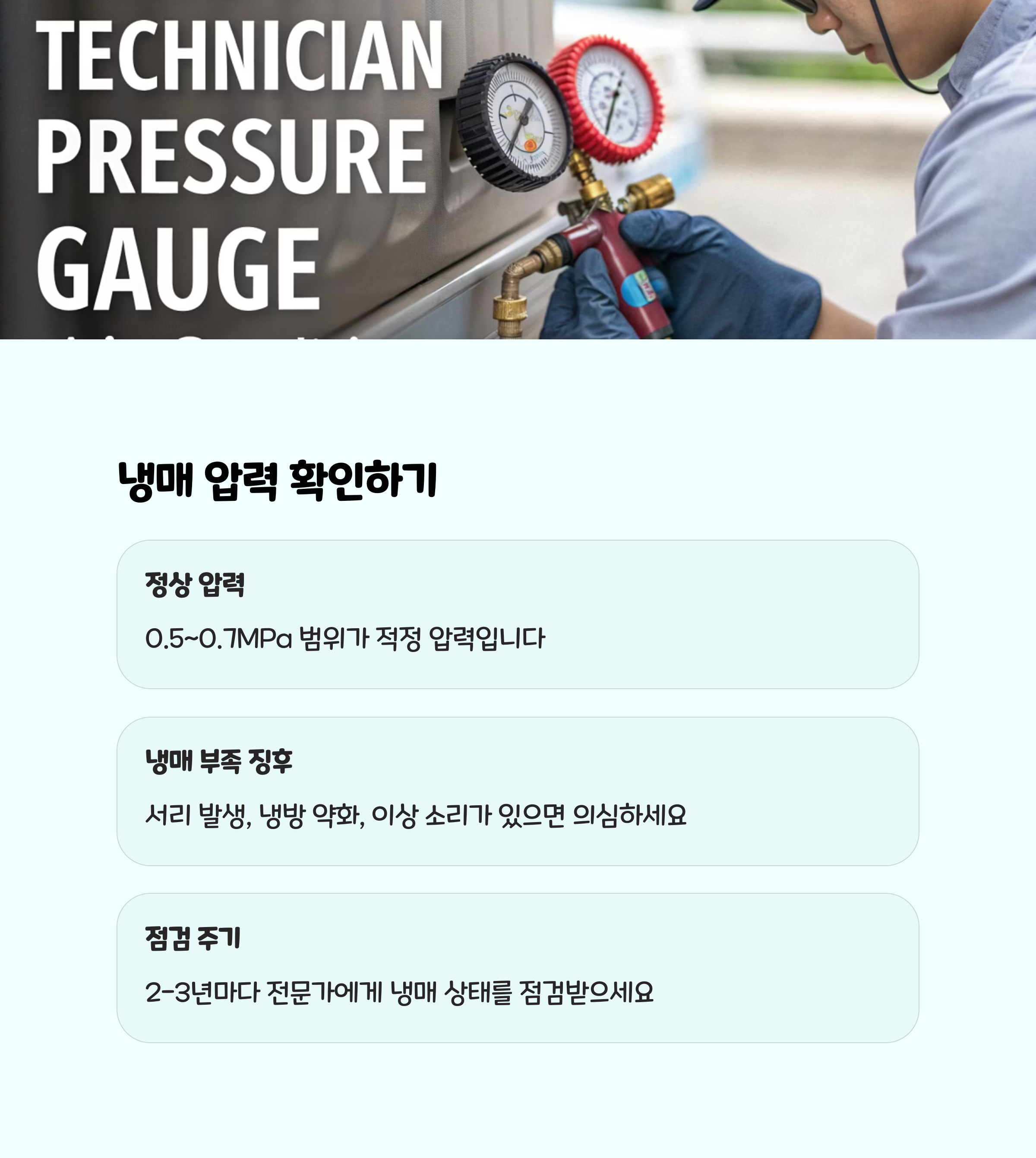 | 냉매 압력 | 6개월 | 동관 온도, 이슬 확인, 필요시 전문가 점검 |
