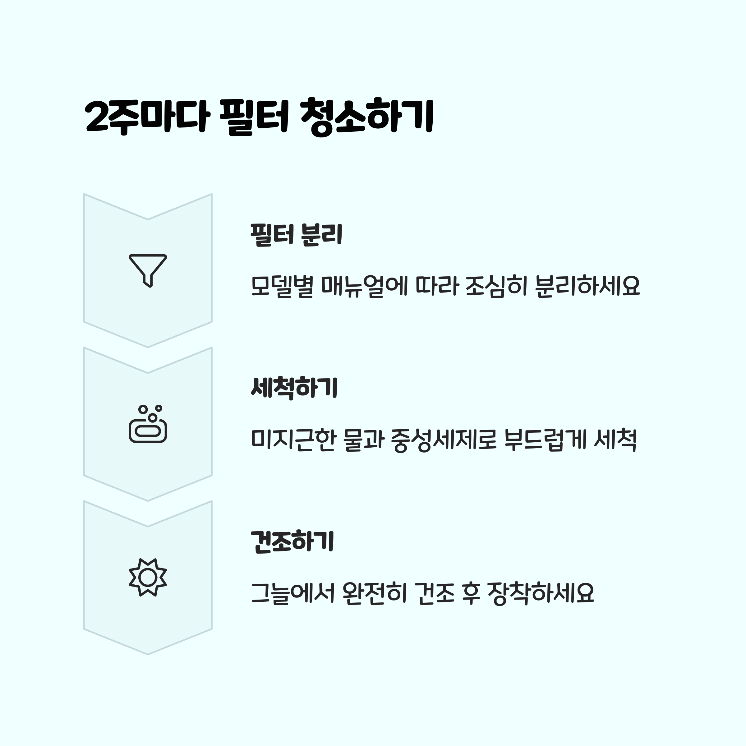 | 필터 청소 | 2주~1개월 | 분리 후 먼지 제거, 미온수 세척, 완전 건조 후 재장착 |
