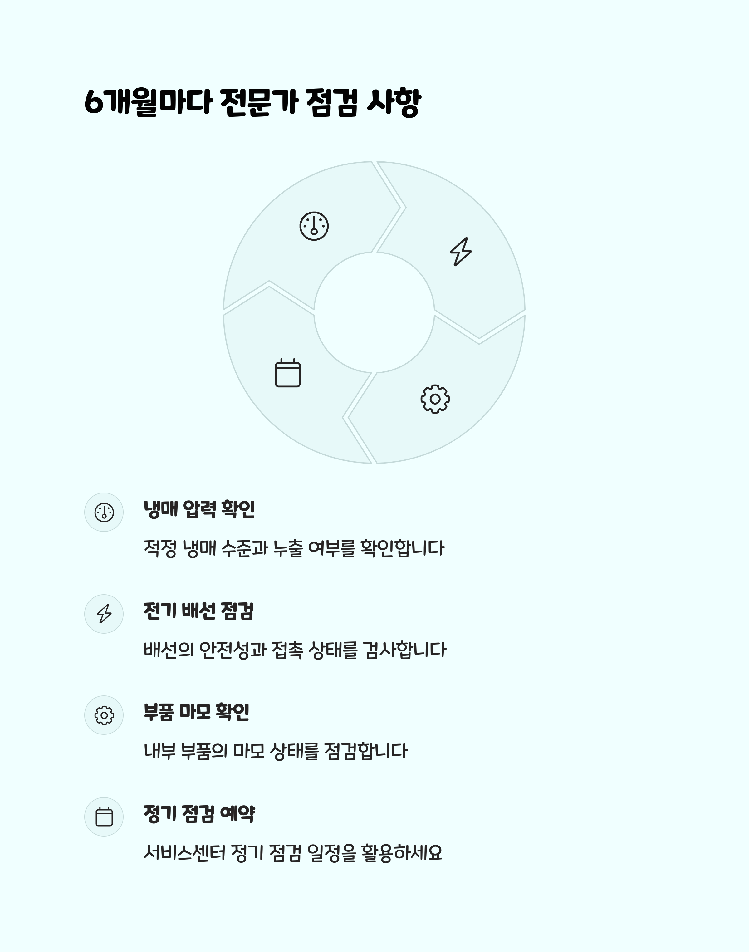 | 전문가 점검 | 6개월 | 냉매, 전기 회로, 부품 점검 |