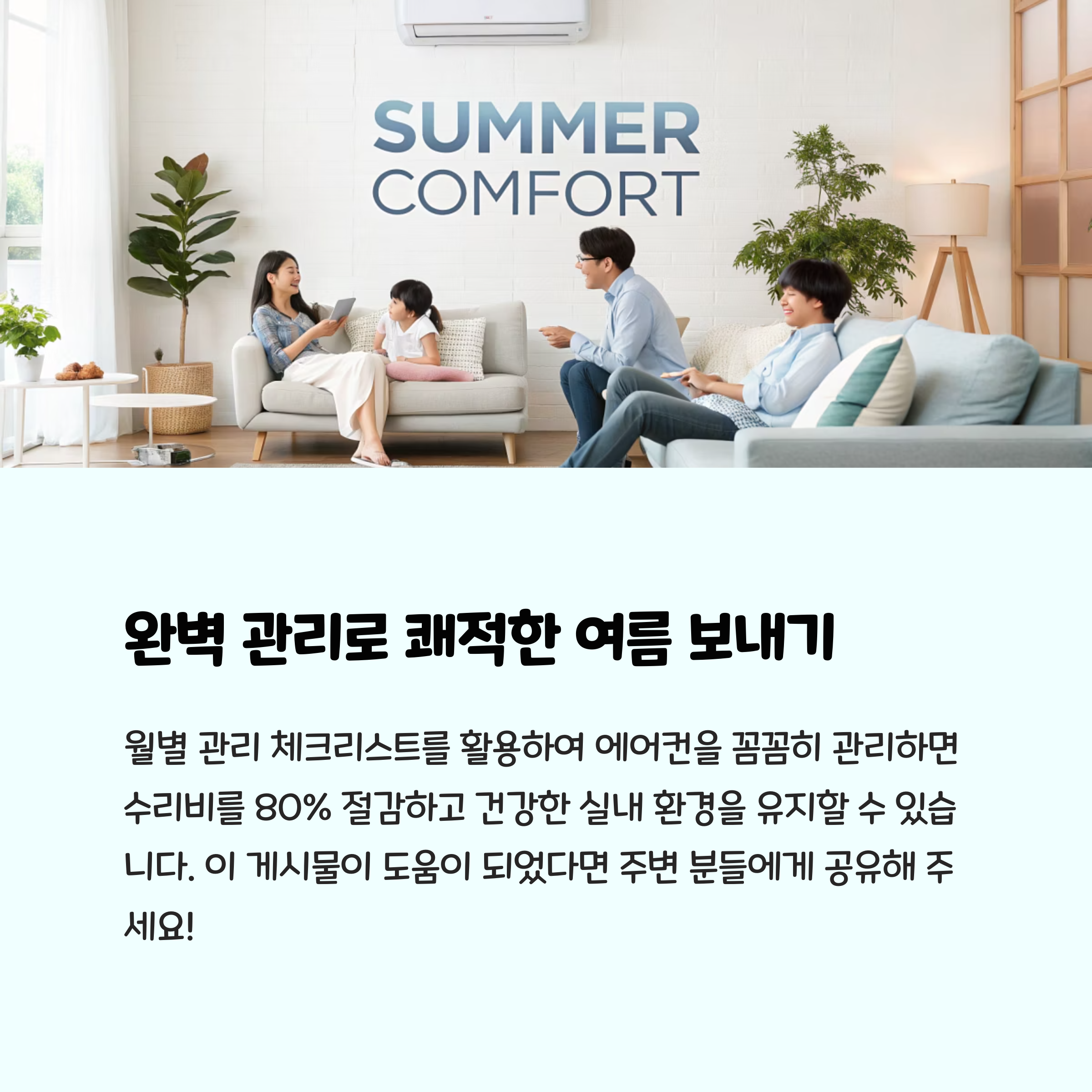 여름철 에어컨 고장 걱정, 이제는 꼼꼼한 관리로 미리 예방할 수 있습니다. 위 체크리스트를 실천하면 냉방 효율은 높이고, 전기요금과 고장 위험은 확실히 줄일 수 있습니다. 올여름, 시원하고 쾌적한 실내 환경을 위해 오늘 바로 점검을 시작해 보세요!