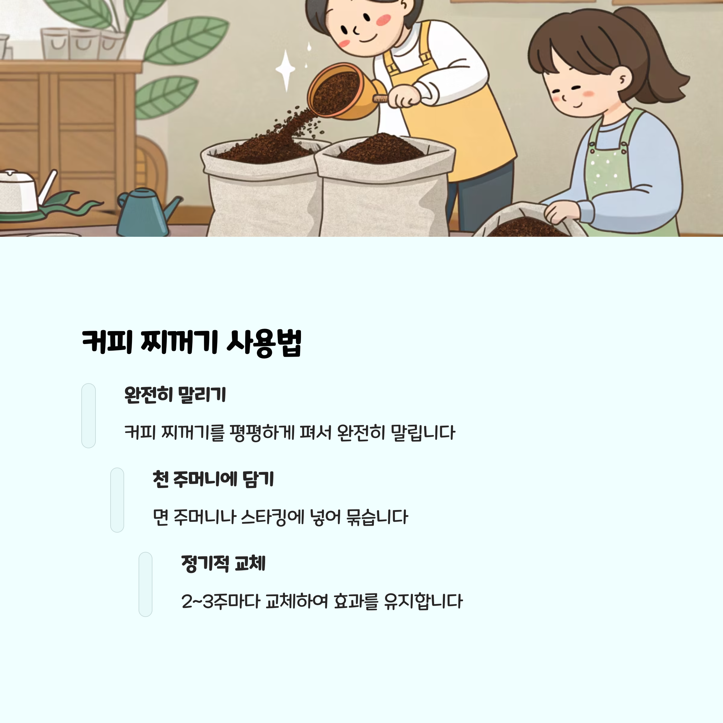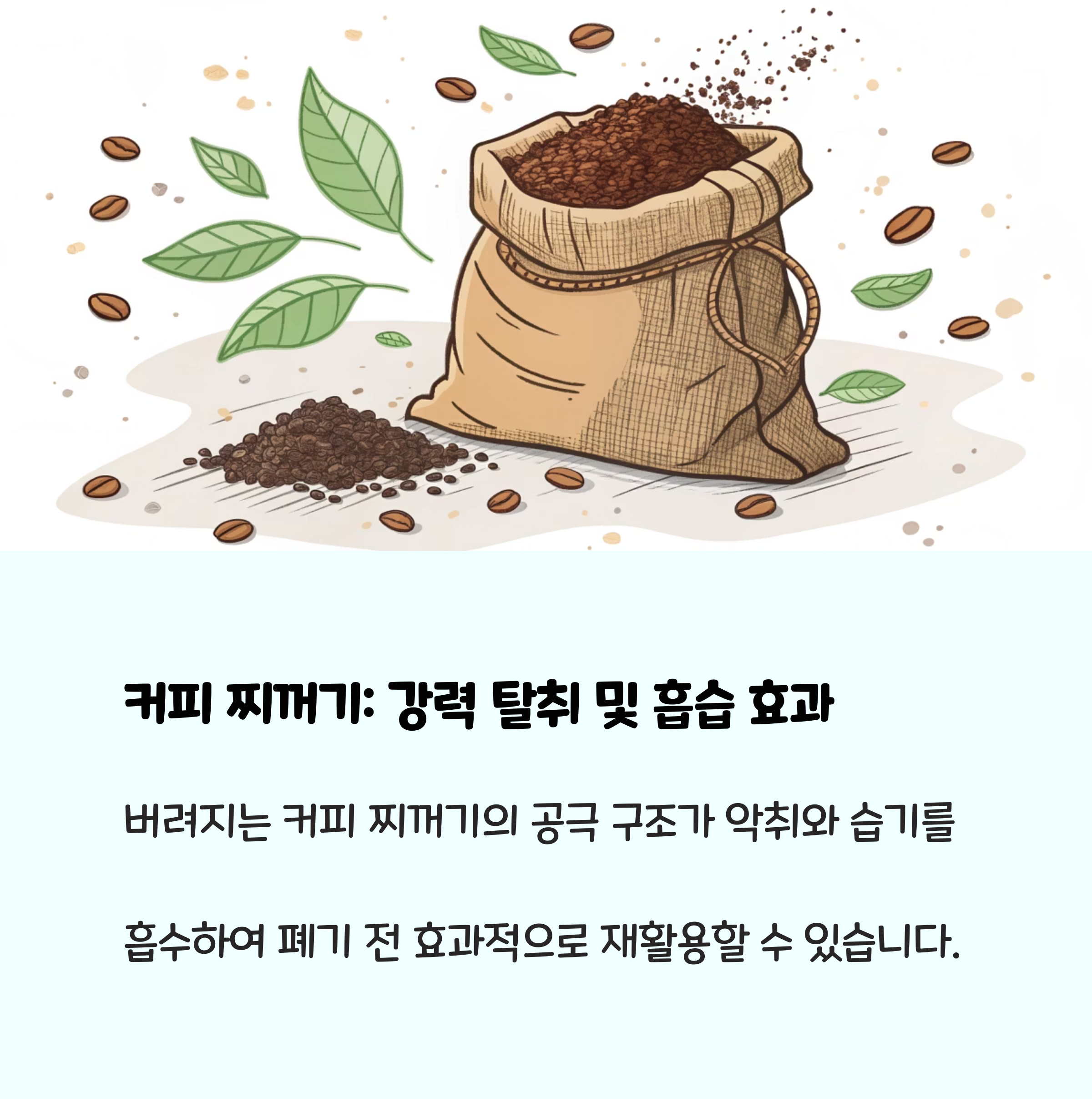 커피 찌꺼기 역시 강력한 탈취 효과와 함께 습기 흡수 능력이 뛰어납니다. 커피 찌꺼기를 말려서 망사 주머니에 담아 옷장에 걸어두면 냄새와 습기를 동시에 관리할 수 있습니다. 단, 찌꺼기는 1~2주마다 교체하거나 햇볕에 말려 곰팡이 발생을 막아야 합니다.