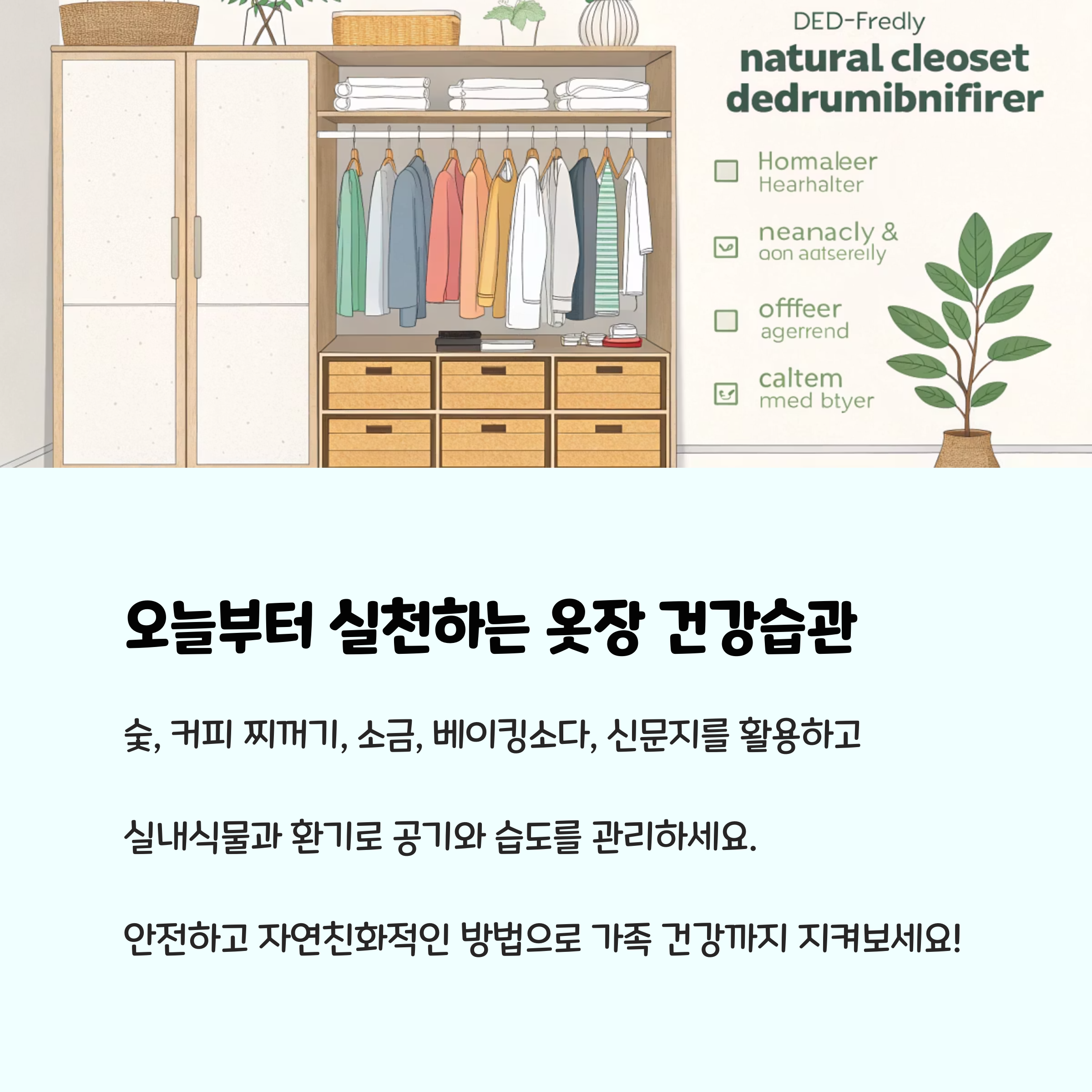 여름철 옷장 관리, 더 이상 고민하지 마세요. 숯, 커피찌꺼기, 굵은소금, 베이킹소다, 신문지, 천연 광물석 등 집에 있는 천연 재료만 잘 활용해도 습기와 냄새를 손쉽게 잡을 수 있습니다. 여기에 실내 식물과 주기적인 환기까지 더하면, 올여름에도 쾌적하고 건강한 옷장을 유지할 수 있습니다.