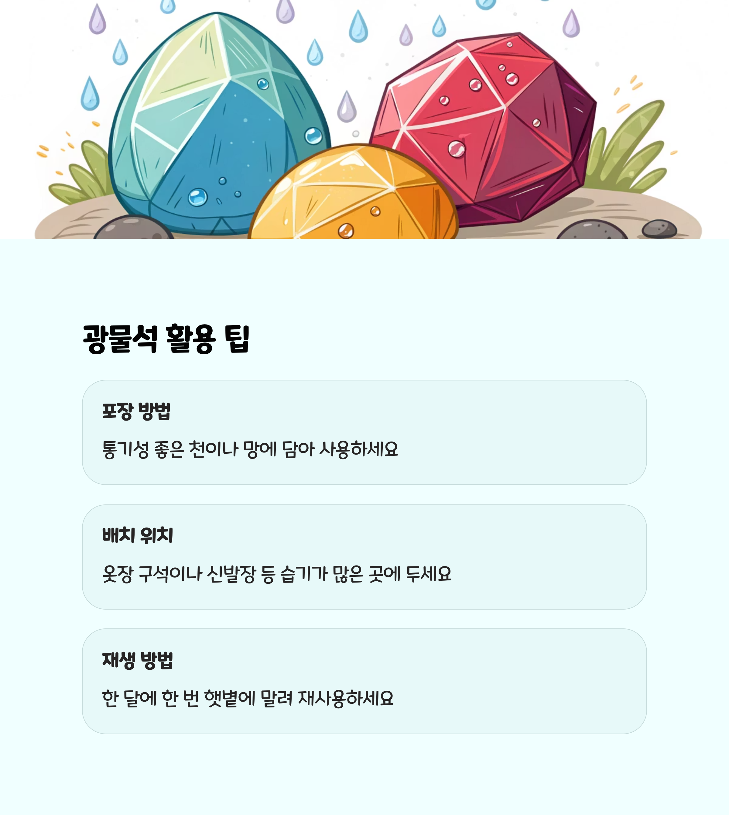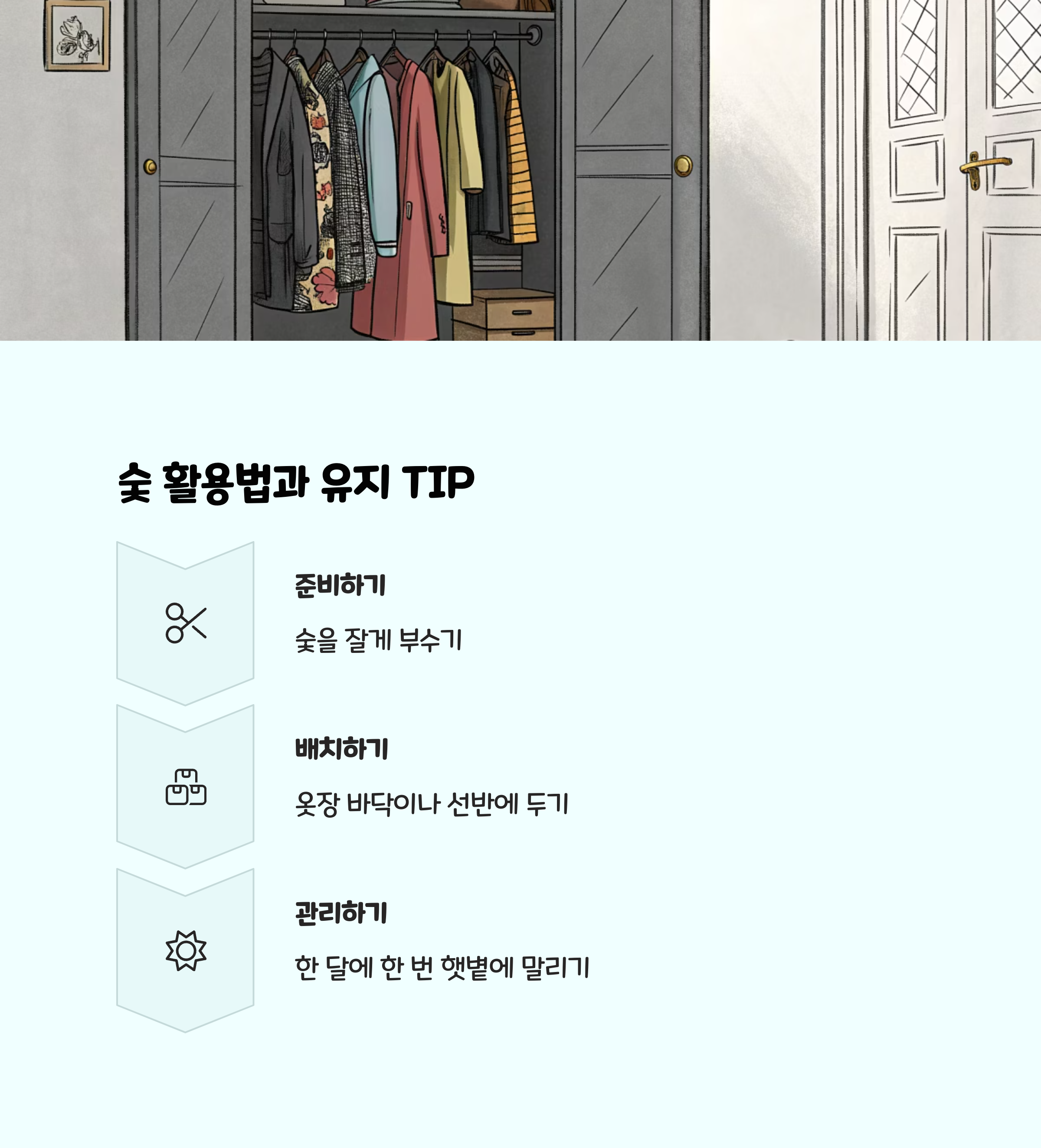 모든 재료는 반드시 잘 말려서 사용하고, 주기적으로 교체하거나 건조시켜야 합니다. 곰팡이나 악취가 발생하지 않도록 옷장도 주기적으로 청소하고 환기시키는 것이 중요합니다. 재료별 사용법을 잘 지켜야 효과가 오래갑니다.