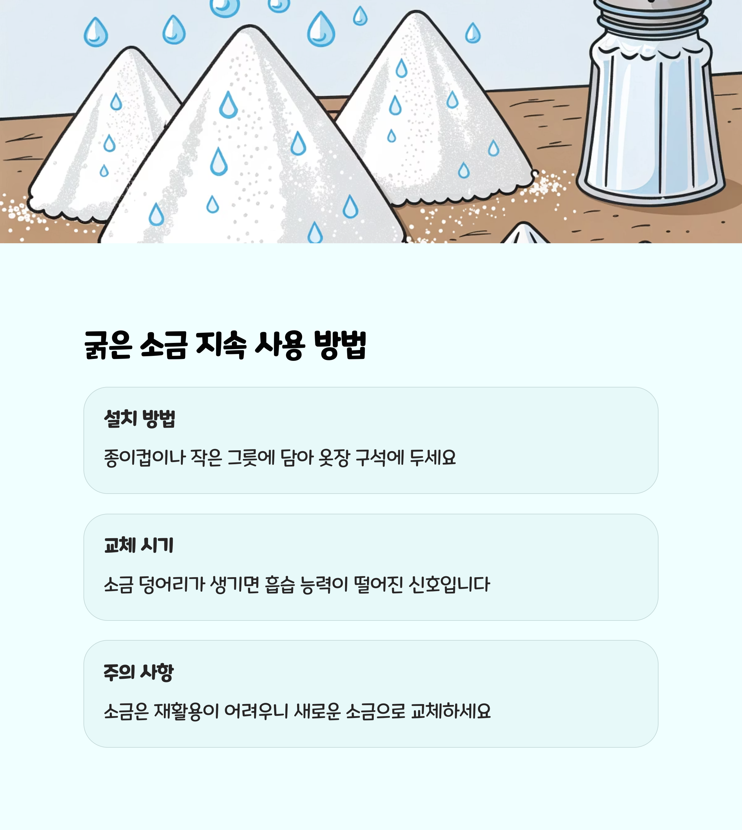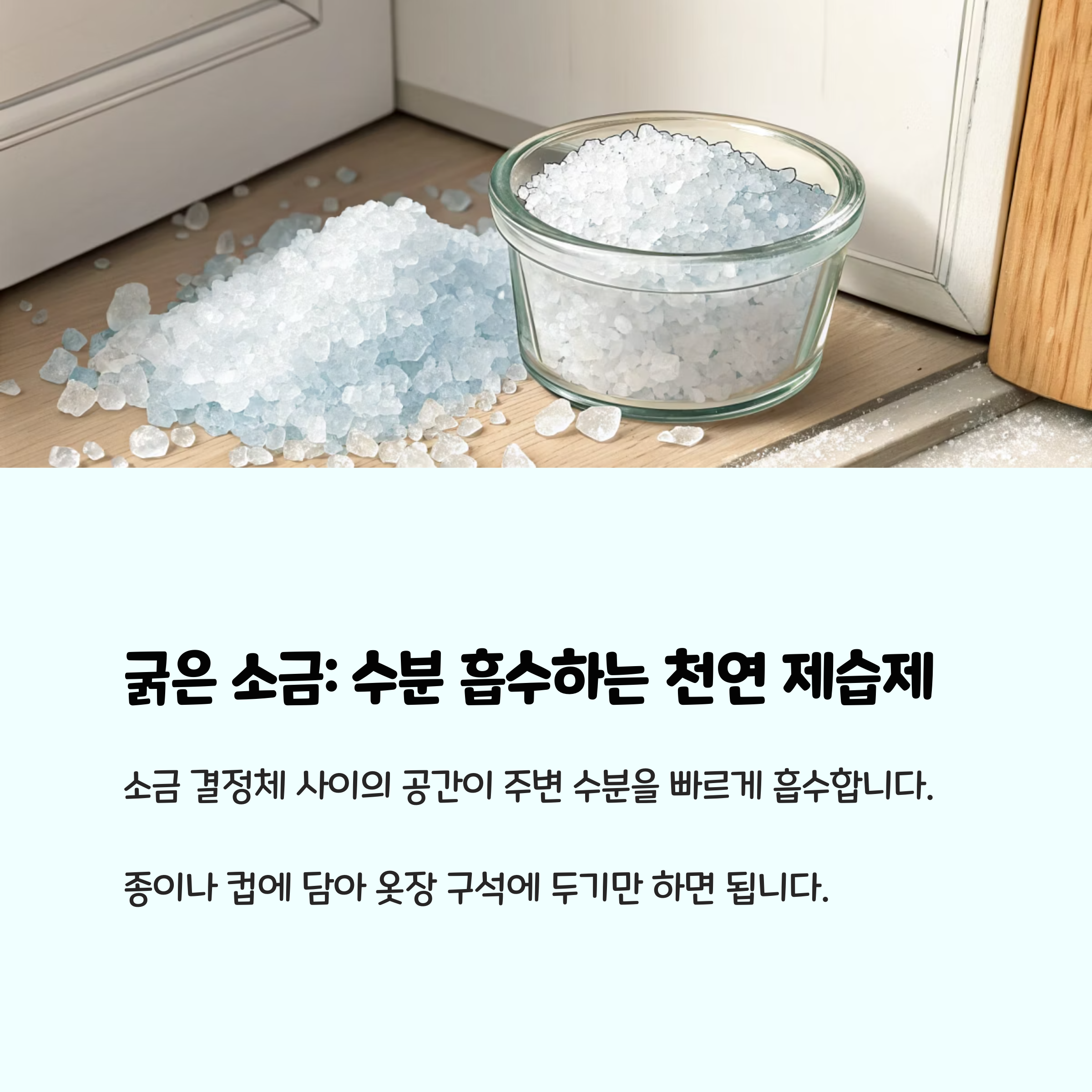 굵은소금은 수분을 빨아들이는 능력이 탁월해 작은 그릇에 담아 옷장 아래쪽에 두면 습기를 효과적으로 흡수합니다. 소금이 눅눅해지면 햇볕이나 전자레인지에 말려 재사용할 수 있어 경제적입니다.