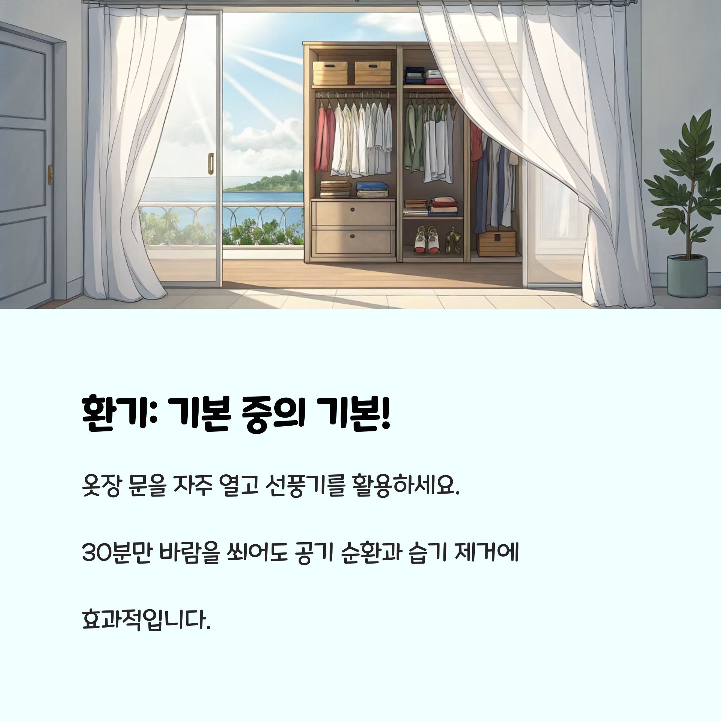 - 주 1~2회 옷장 문을 활짝 열어 환기시키고, 선풍기를 틀어 공기를 순환시키면 습기와 냄새를 근본적으로 줄일 수 있습니다.