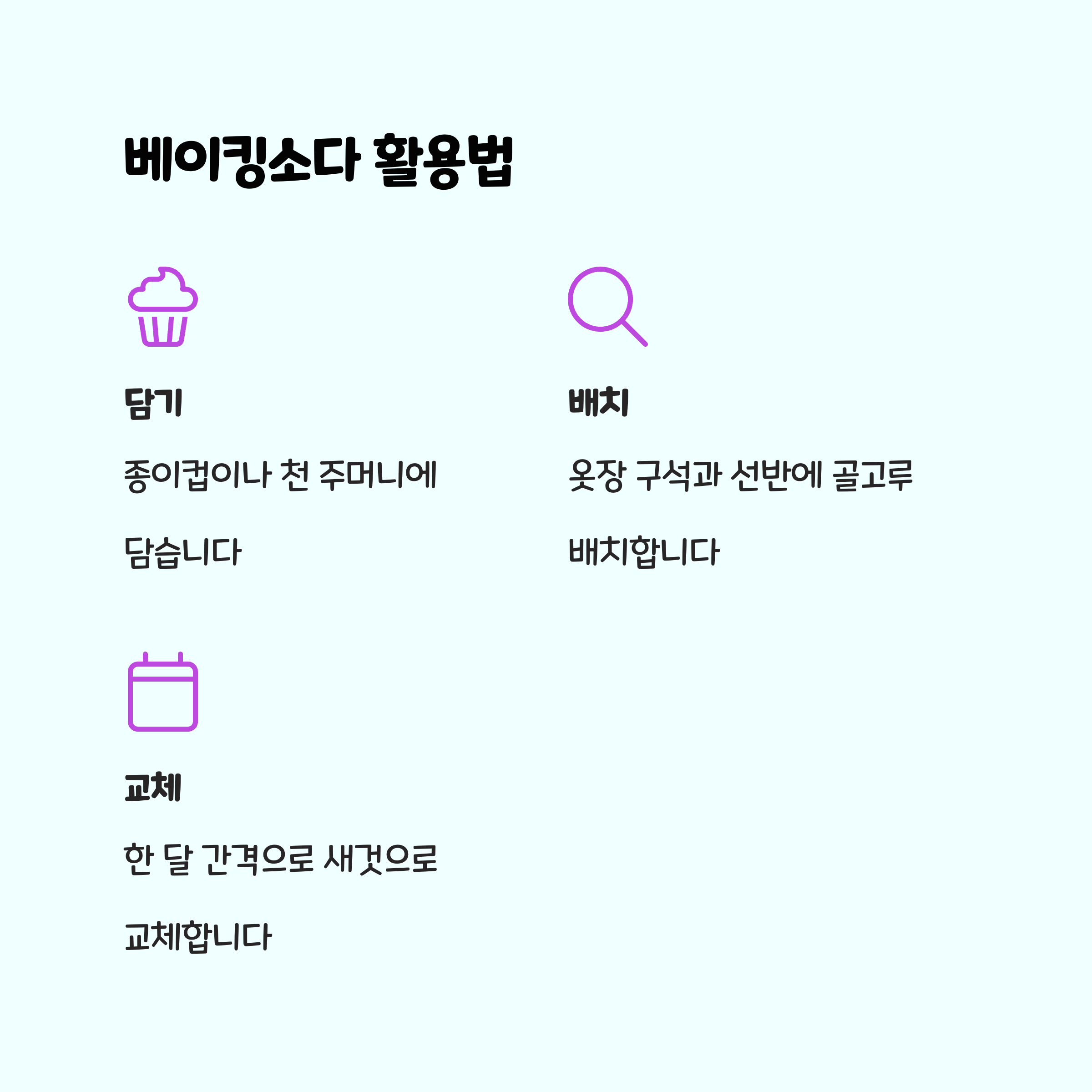 베이킹소다는 냄새 분자와 결합해 탈취 효과를 내며, 습기 제거에도 탁월합니다. 한지나 부직포에 베이킹소다를 담아 옷장이나 서랍에 넣어두면 뽀송뽀송한 상태를 오래 유지할 수 있습니다. 세탁 시에도 1~2스푼을 넣으면 땀 냄새 제거와 섬유 유연제 효과까지 볼 수 있습니다.