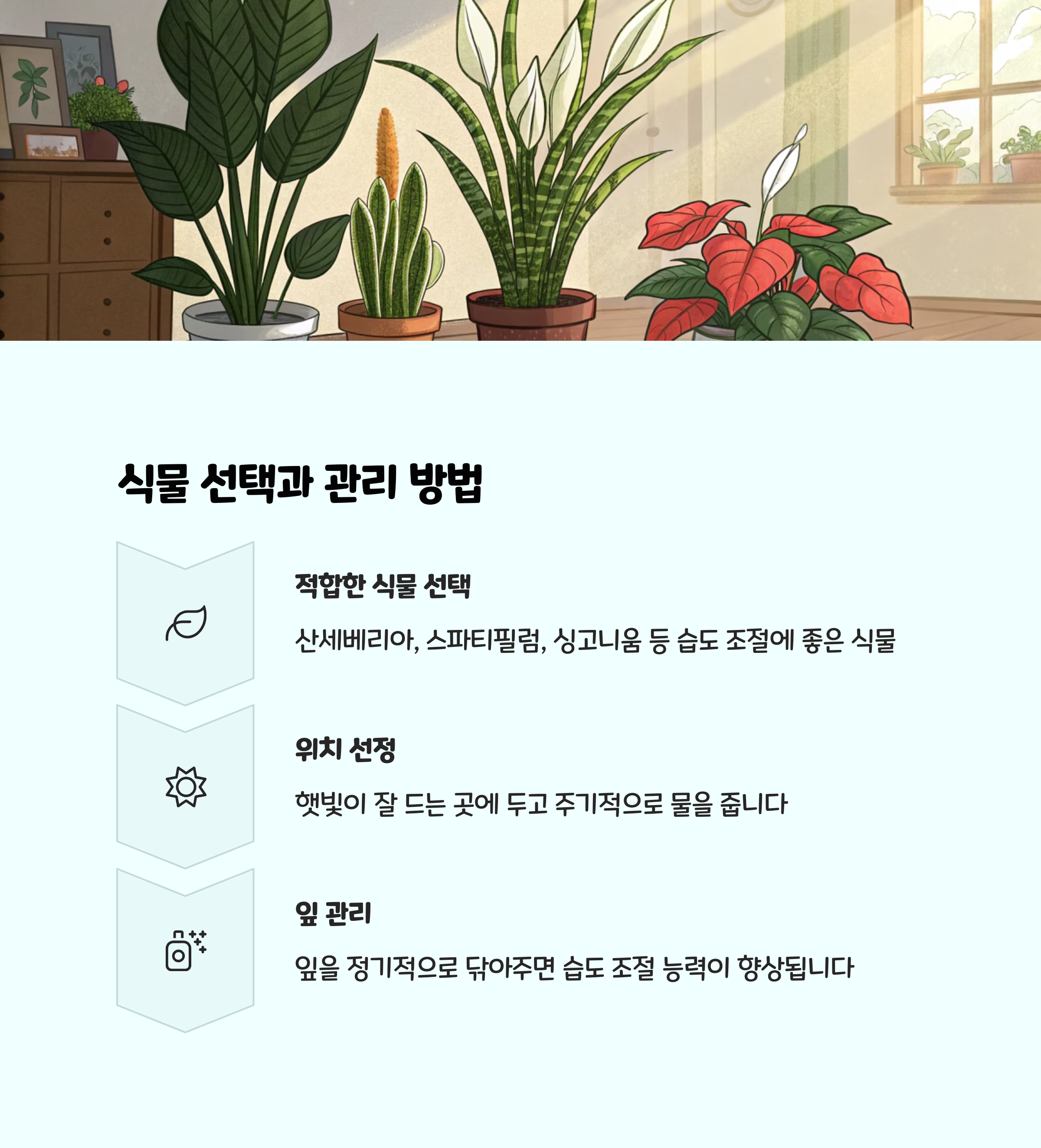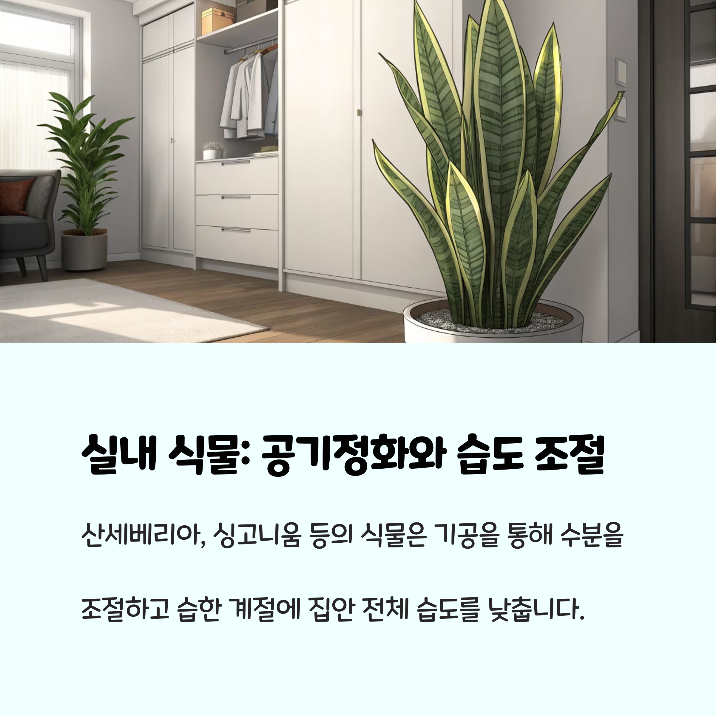 - 산세베리아, 틸란드시아, 관음죽 등 실내 식물은 습기와 냄새를 흡수해 주고, 집안 분위기까지 산뜻하게 만들어줍니다.