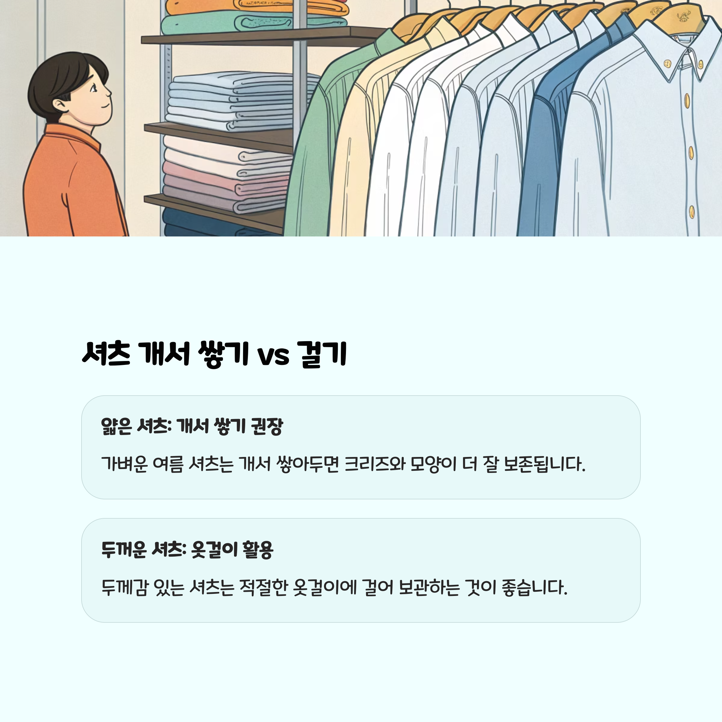 여름 셔츠는 한 번 입고 바로 세탁하는 것이 가장 좋습니다. 땀과 기름이 옷에 오래 남으면 냄새와 변색이 심해지기 때문입니다. 세탁 후에는 완전히 건조시킨 뒤, 통풍이 잘 되는 곳에 보관하세요. 옷이 눅눅하면 해충이 생기거나 황변이 더 쉽게 일어납니다. 투명 플라스틱 박스 대신 천 커버나 불투명 박스를 사용하면 햇빛에 의한 변색도 막을 수 있습니다.