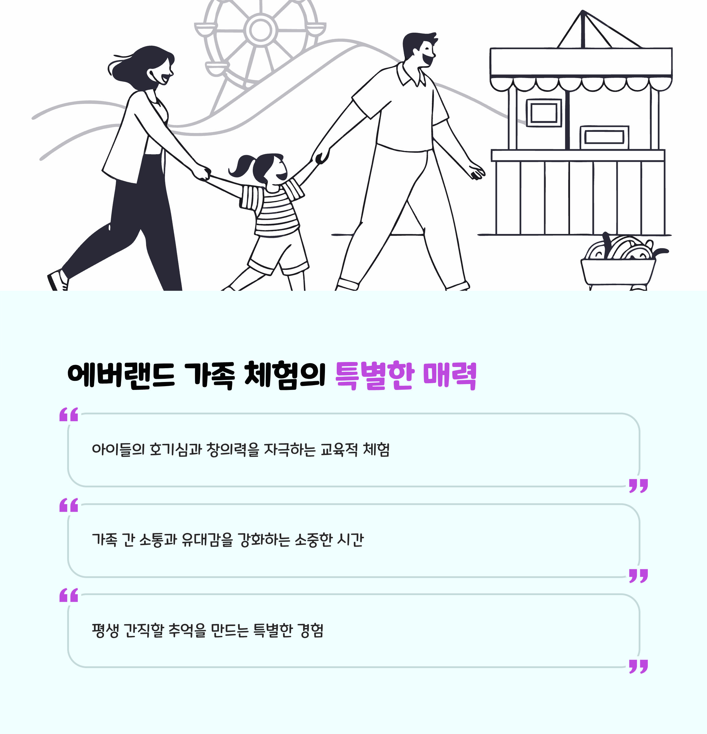 많은 가족이 에버랜드를 방문하며 체험 프로그램에 대한 사전 정보 부족으로 고민하는 경우가 많습니다. 에버랜드는 연령별 맞춤형 공간과 프로그램으로 이를 해결합니다. 3세부터 10세 어린이까지 즐길 수 있는 ‘키즈빌리지’, 깨끗한 천연 모래와 볼하우스가 마련된 ‘이솝빌리지’, 그리고 자유롭게 블록놀이와 체험이 가능한 ‘브렌시아존’ 등 체험 공간이 다양하고 안전하게 조성되어 있습니다.
