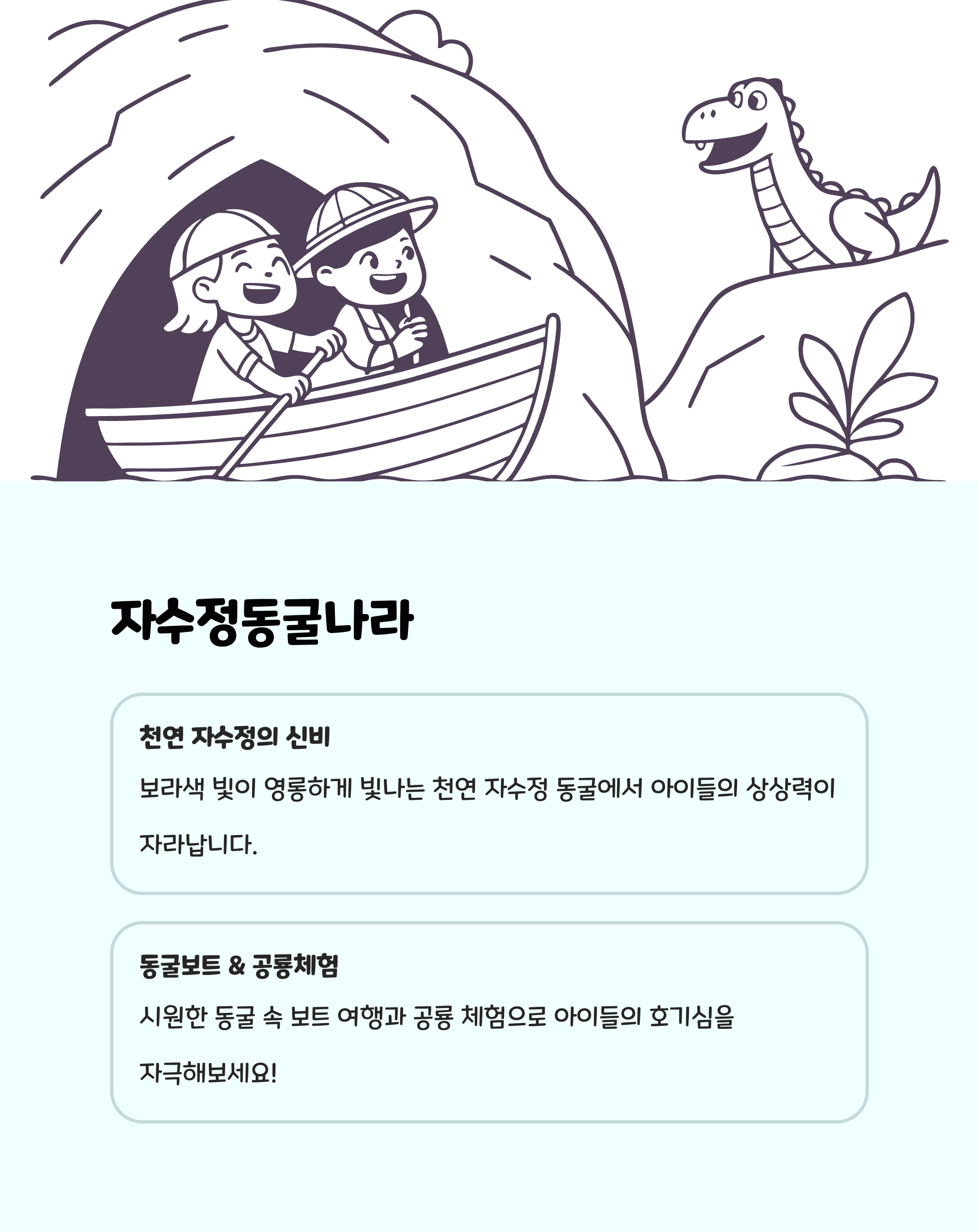 위치: 울산 울주군 삼남면 자수정로 212특징: 울산 울주군에 위치한 자수정동굴나라는 총 2.5km 길이의 동굴 탐험 공간으로, 6,500만 년 전 형성된 천연 자수정과 화강암을 감상할 수 있습니다. 동굴 내부에는 공룡 전시, 미디어아트, 기(氣)체험관 등 다양한 체험 공간이 있어 아이들의 호기심을 자극합니다. 보트를 타고 동굴 속 호수를 탐험하는 특별한 체험도 가능하며, 연중 시원한 온도가 유지되어 여름철 피서지로도 인기가 많습니다.추천 이유: 자연과 역사를 함께 체험할 수 있는 공간으로, 아이들의 탐구심과 상상력을 동시에 자극합니다. 다양한 놀이와 교육 프로그램이 가족 모두에게 즐거움과 배움을 선사하며, 연중 쾌적한 환경 속에서 특별한 가족 여행을 계획하기에 적합한 장소입니다.