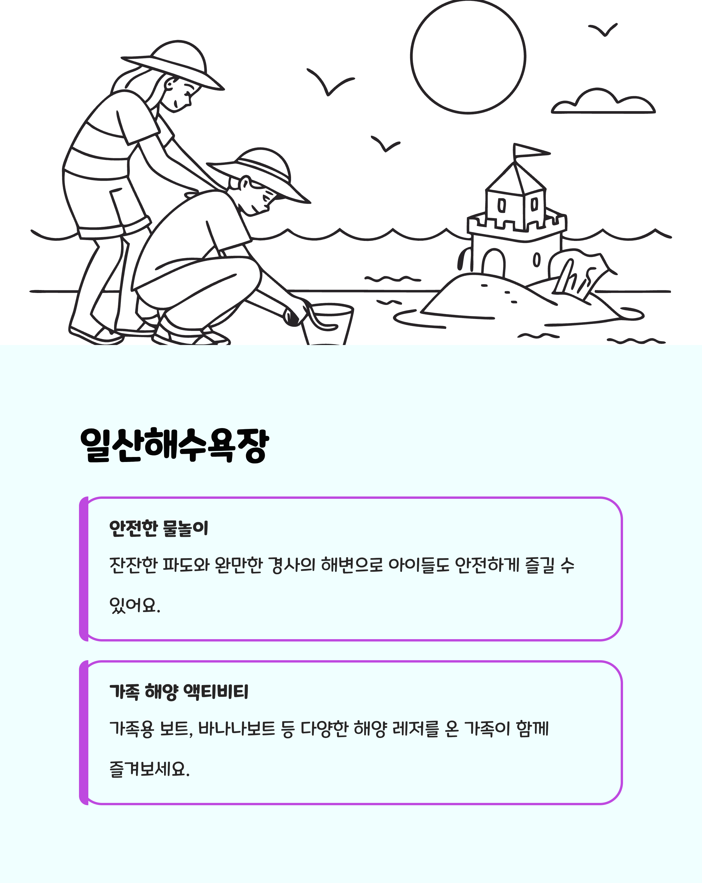 위치: 울산 동구 일산동특징: 울산 동구 일산동에 위치한 잔잔한 파도의 해수욕장으로, 가족용 보트와 피크닉 공간, 다양한 해양 액티비티가 마련되어 있습니다. 안전한 물놀이 환경을 갖추고 있어 어린이와 함께하는 해양 체험 장소로 인기가 높습니다. 주변 자연 경관이 뛰어나 산책과 휴식 공간으로도 훌륭하며, 가족 단위 방문객이 편안히 쉴 수 있는 공간입니다.추천 이유: 자연과 함께하는 여유로운 물놀이 및 휴식 공간으로 안전이 확보되어 온 가족이 즐거운 시간을 보낼 수 있습니다. 다양한 해양 체험으로 아이들에게 특별한 추억을 제공하는 최적의 가족 휴양지입니다.