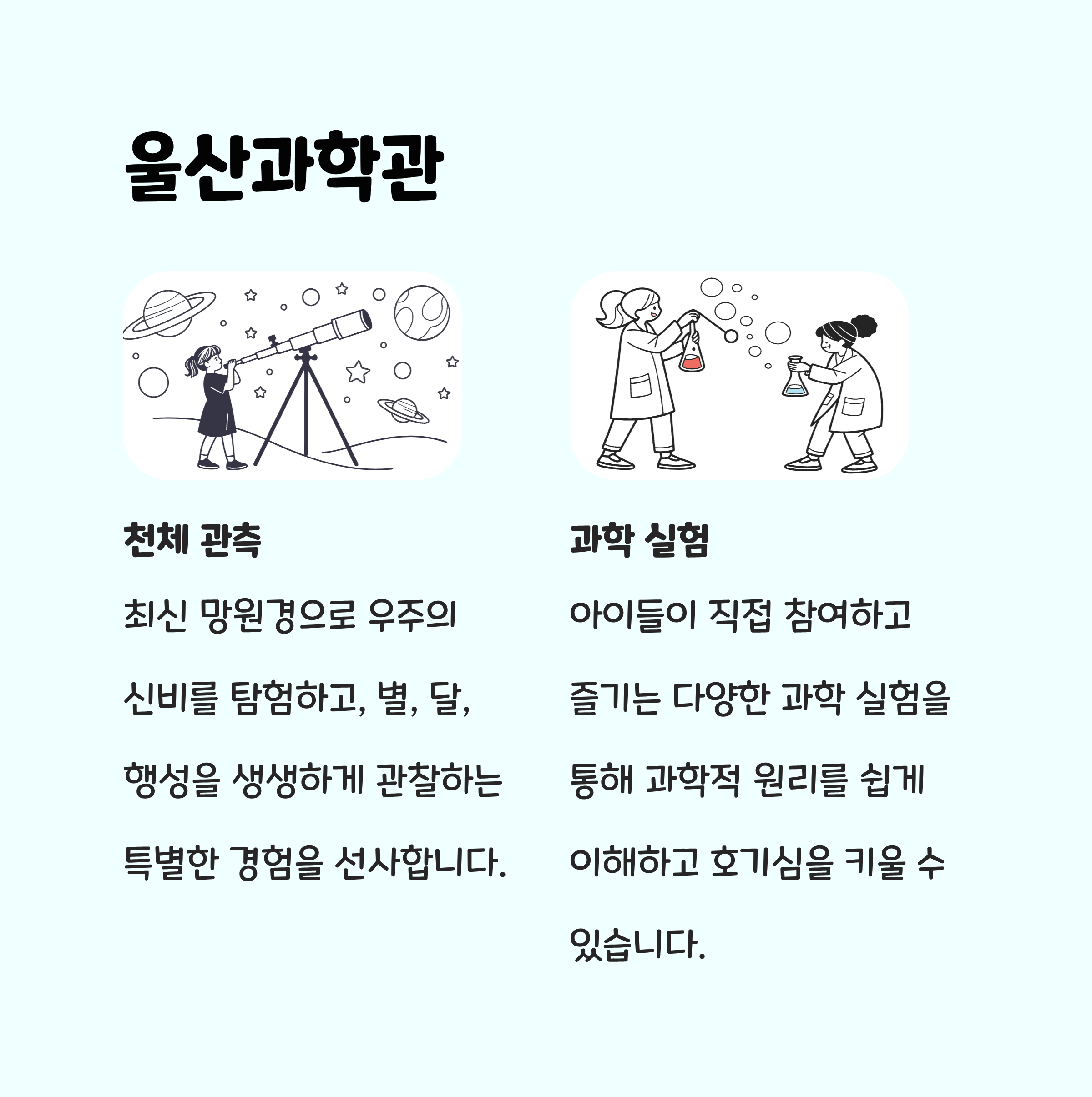 위치: 울산 남구 옥동 남부순환도로 111특징: 울산 남구에 위치한 울산과학관은 천체돔과 다양한 과학 실험실, 조명 전시 등 과학 교육에 특화된 공간입니다. 어린이부터 어른까지 모두가 과학 원리를 쉽게 배우고 체험할 수 있도록 구성되어 있으며, 정기적인 과학 콘서트와 전시도 진행됩니다. 놀이형 전시가 많아 창의적 학습에 도움을 주며, 가족 단위 방문객의 교육과 여가를 동시에 고려한 복합 공간입니다.추천 이유: 아이들의 호기심을 자극하고 과학에 대한 이해를 높여주는 교육 명소로, 체험과 학습을 동시에 즐길 수 있어 가족 모두에게 유익한 시간을 선사합니다. 과학에 관심 있는 아이들에게는 특히 귀중한 체험 기회입니다.