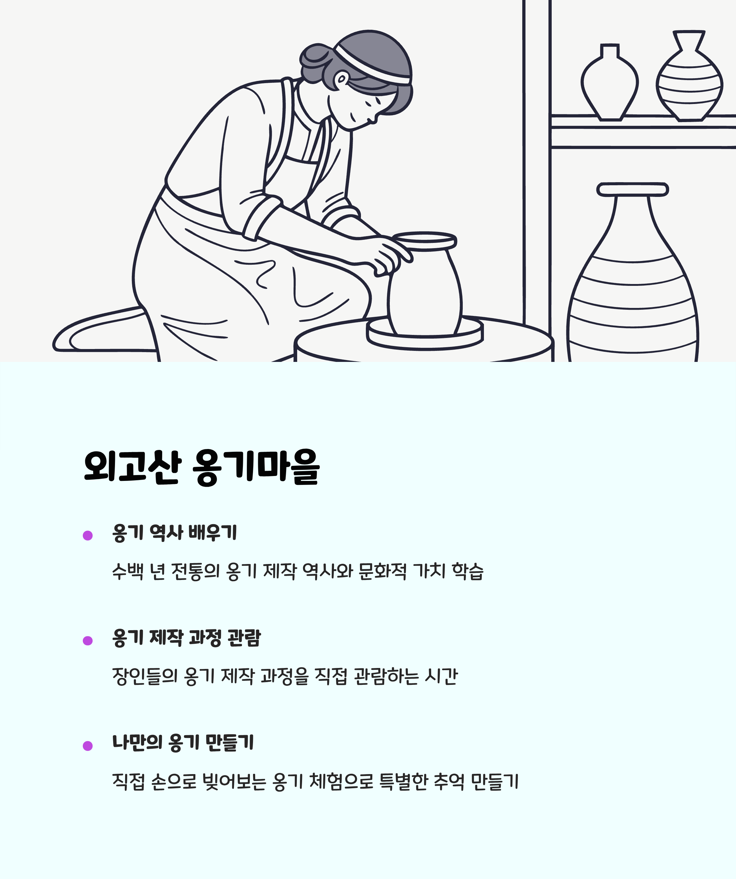 위치: 울산 울주군 온양읍 외고산3길 36특징: 울산 울주군 온양읍에 위치한 외고산 옹기마을은 전통 옹기 제작과 옛 김치 보관법 등 한국 고유의 생활 문화를 체험할 수 있는 장소입니다. 흙 반죽과 손으로 만드는 공예 체험이 가능하며, 아이들이 전통 공예와 역사에 쉽게 접근할 수 있도록 다양한 체험 프로그램이 운영됩니다. 마을 주변 풍경도 아름다워 가족 나들이 장소로 적합합니다.추천 이유: 전통 문화 체험과 창의력 증진을 동시에 할 수 있는 공간으로 아이들의 문화적 소양을 키우기에 좋습니다. 가족이 함께 참여하며 즐길 수 있는 교육적이고 뜻깊은 체험장입니다.