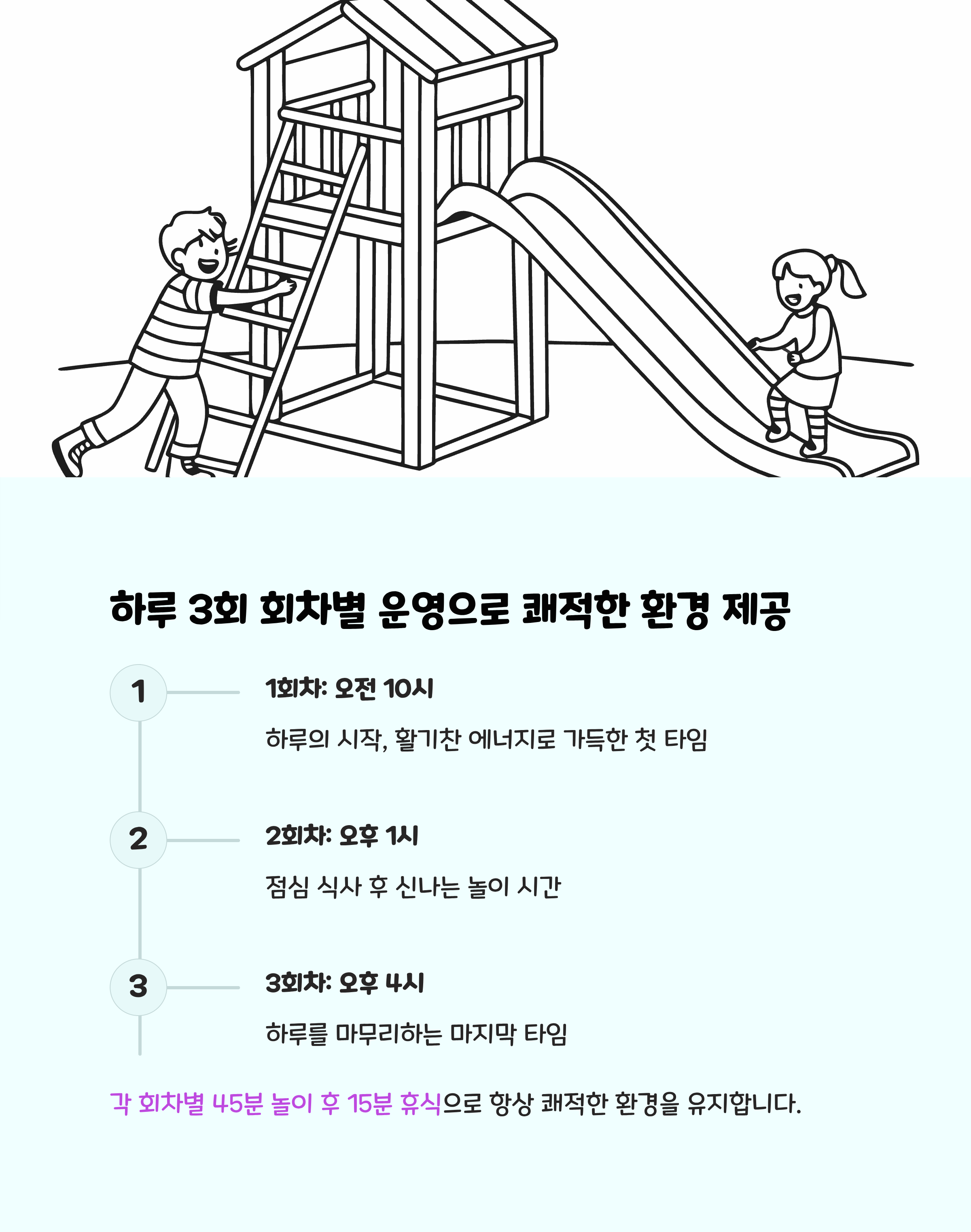 하루 3회에 걸쳐 2시간씩 실내놀이터 이용 시간을 나누어 운영해 쾌적한 환경과 안전한 관리를 도모합니다.