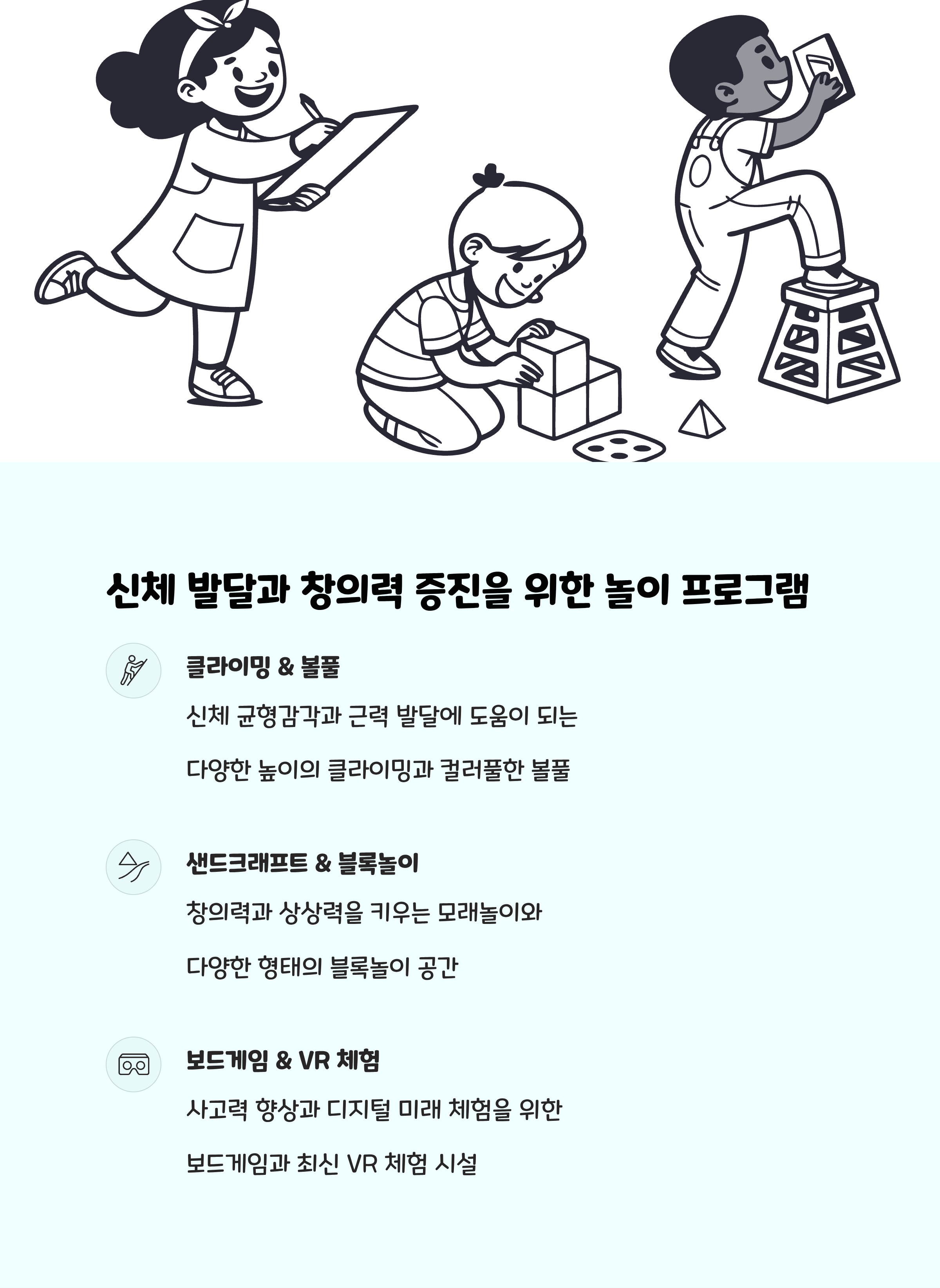 울산시립어린이테마파크는 클라이밍, 볼풀, 미니 회전기구 같은 신체 놀이 공간과 함께 블록놀이, 보드게임, VR체험 등 창의력 증진 프로그램을 다양한 회차로 운영하여 어린이의 신체와 두뇌 발달을 고루 돕습니다. 특히 하루 3회 회차별 운영으로 몰리지 않고 쾌적하게 이용할 수 있습니다.