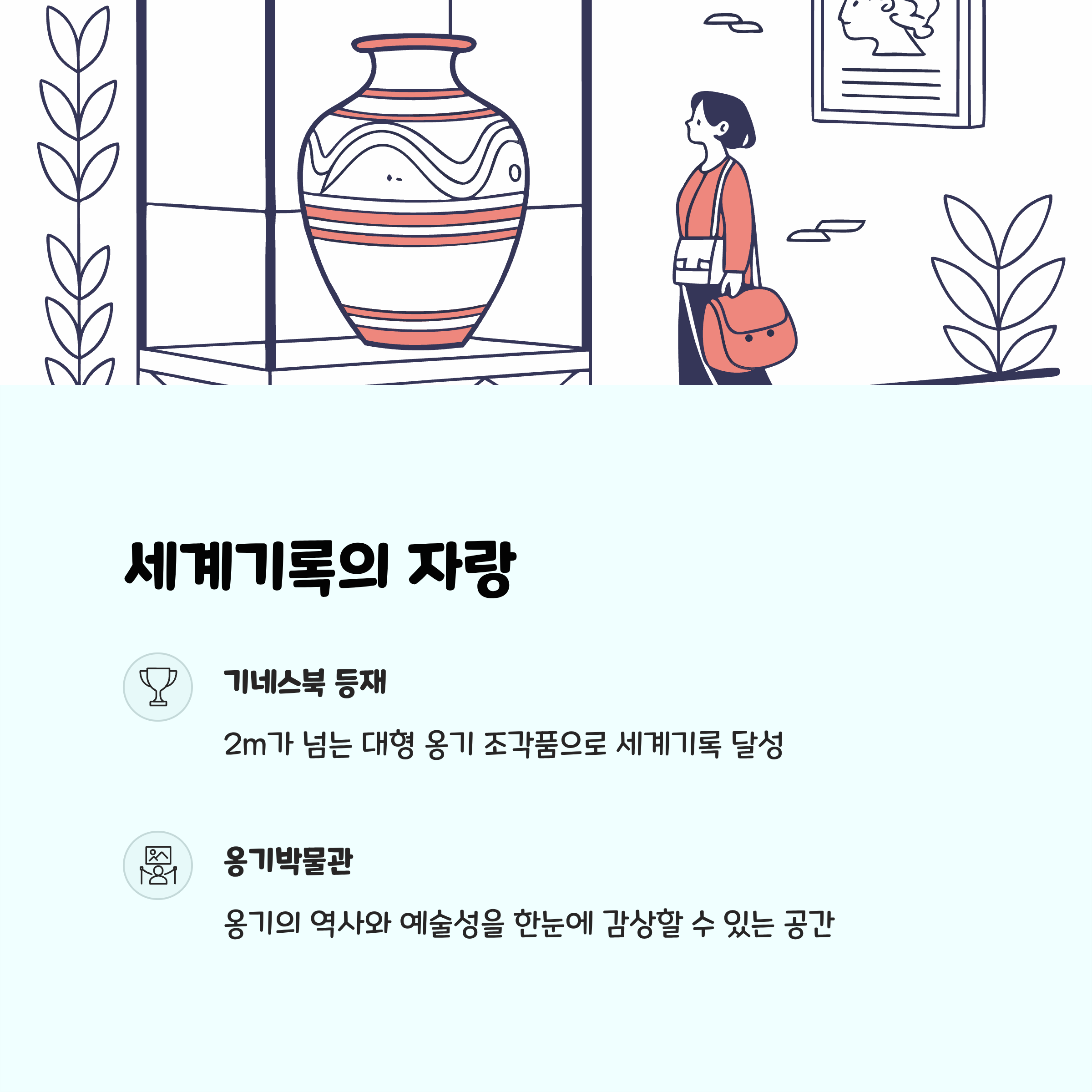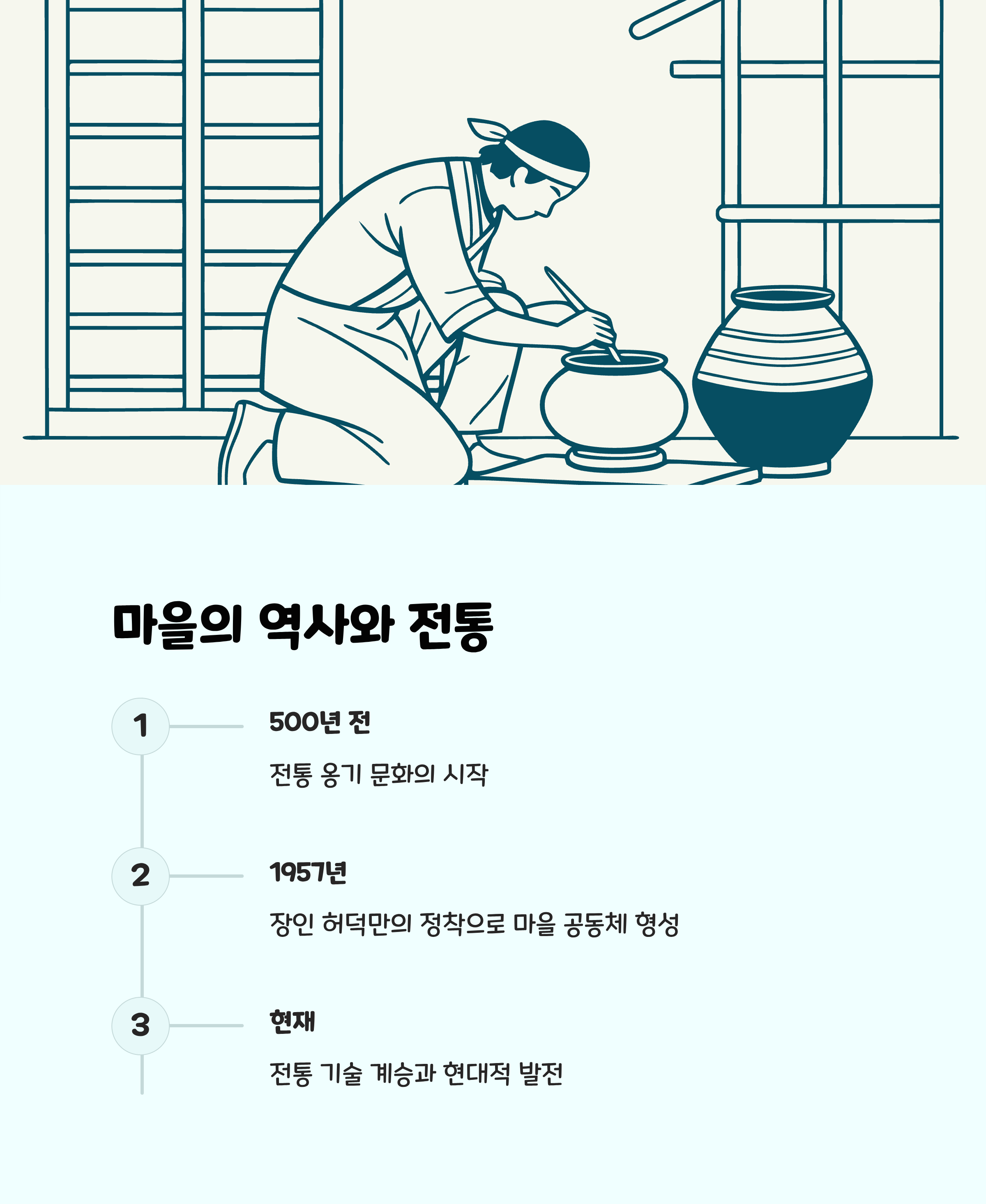우리나라 전체 옹기 생산량의 50% 이상을 생산하는 옹기 장인 350여 명이 활동하는 국내 최대 옹기촌입니다. - 옹기는 김치, 장류 등 한국 전통 음식을 담는 데 필수적인 생활 도구이며, 전통의 손길이 살아있는 귀중한 문화유산이기도 합니다.