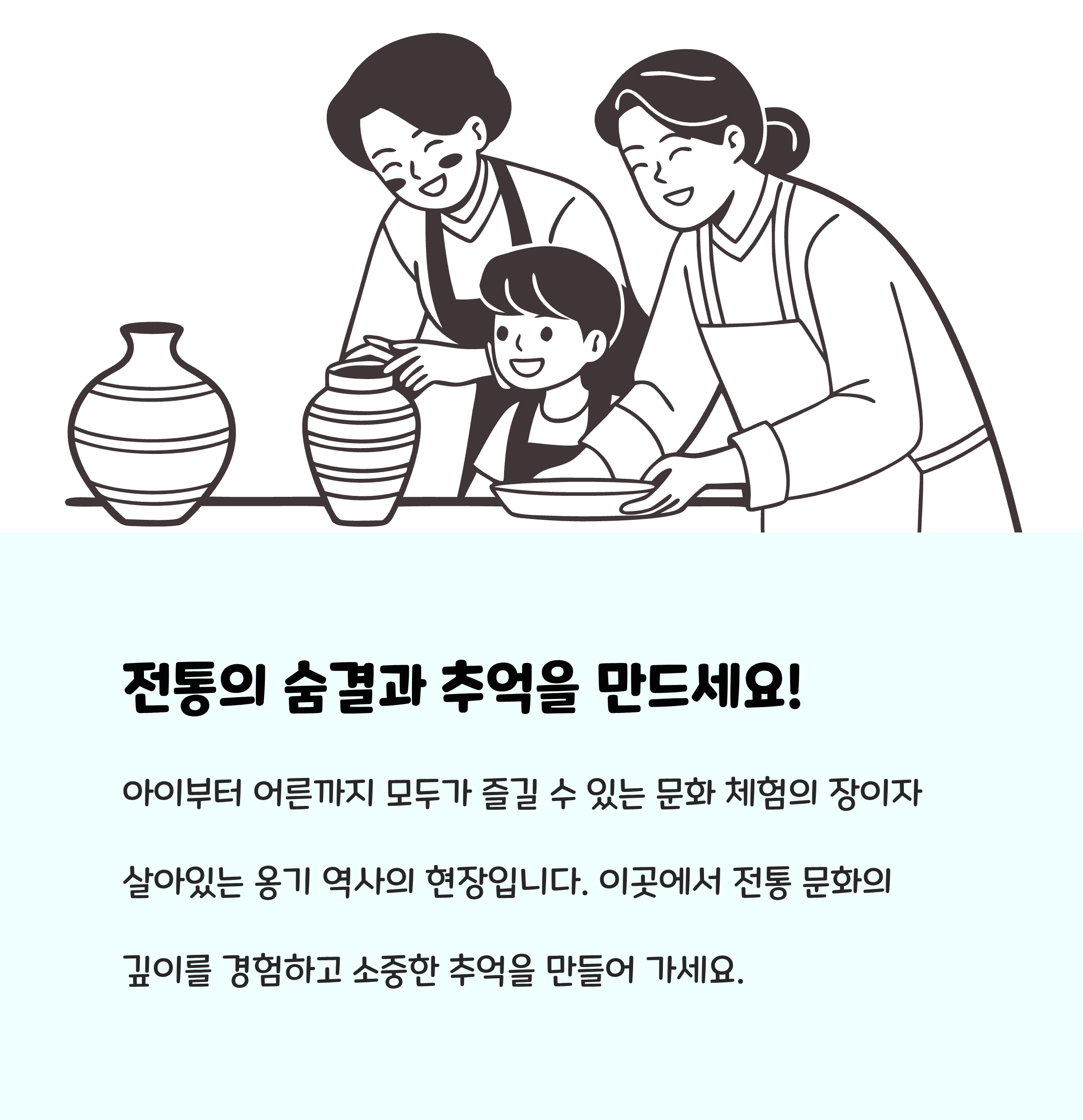 - 방문객들은 옹기 장인의 작업 과정을 눈앞에서 직접 관찰하고, 흙 놀이 및 간단한 도자기 만들기 체험에 참여할 수 있어 아이들과 함께 전통문화를 배우기에 최적입니다.