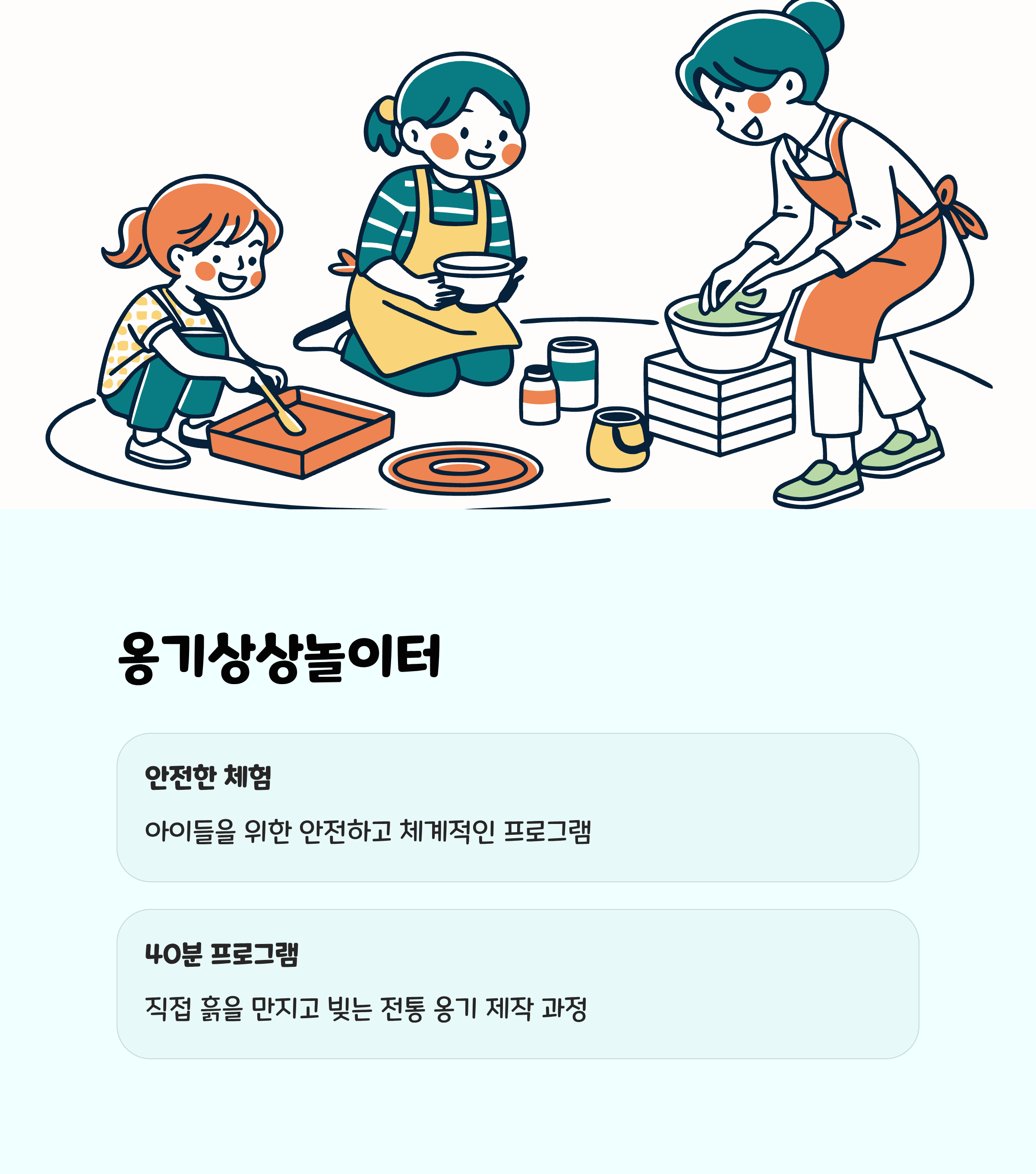 만 4세 이상의 어린이부터 어른까지 참여할 수 있는 옹기 빚기, 그릇 만들기, 그림 그리기 체험이 기본입니다. 체험관은 예약제로 운영되며, 약 40분 동안 전통 옹기 제작 과정을 직접 경험할 수 있습니다.