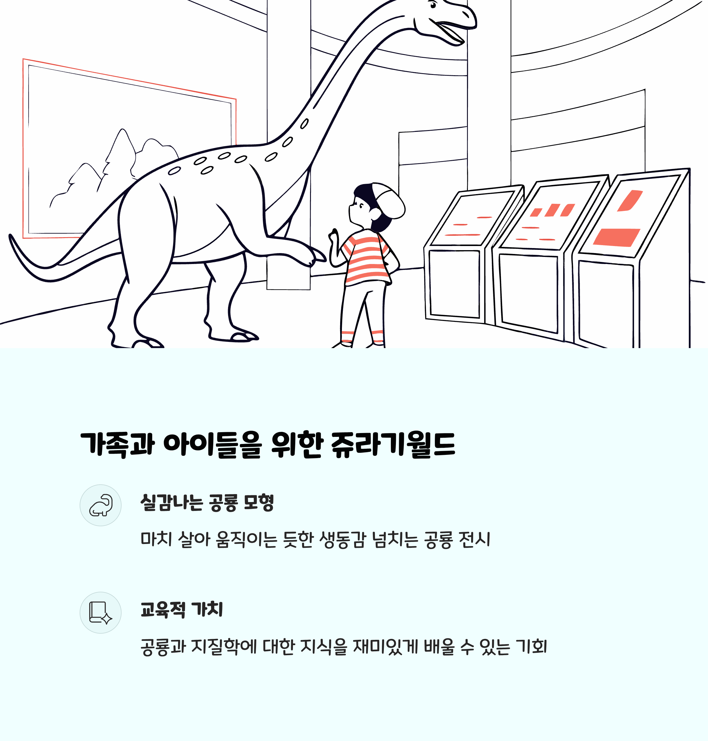 - 카트장, 쥬라기월드 등 교육적이고 재미있는 체험존 포함