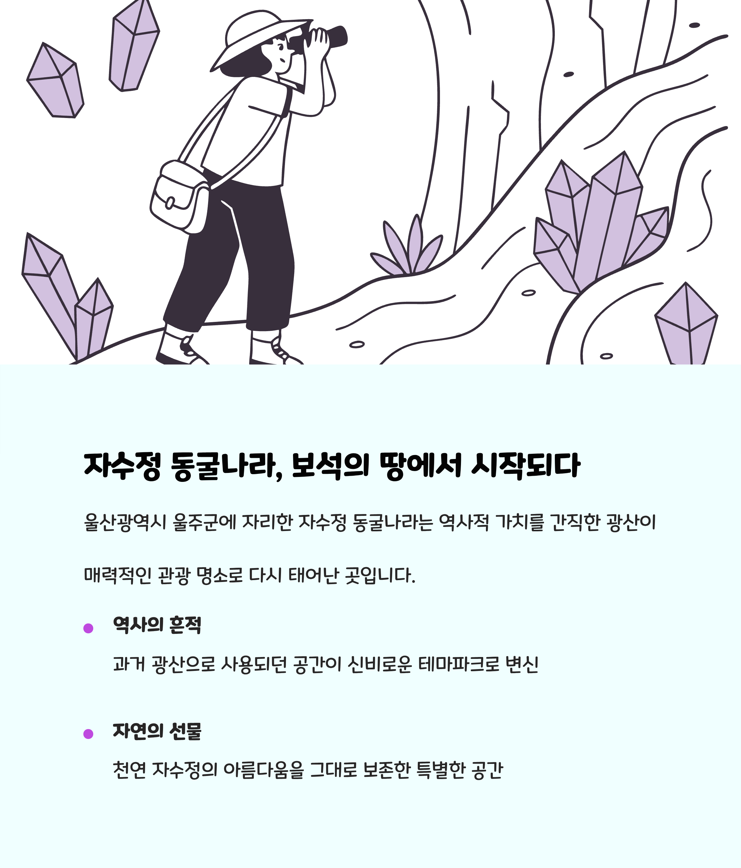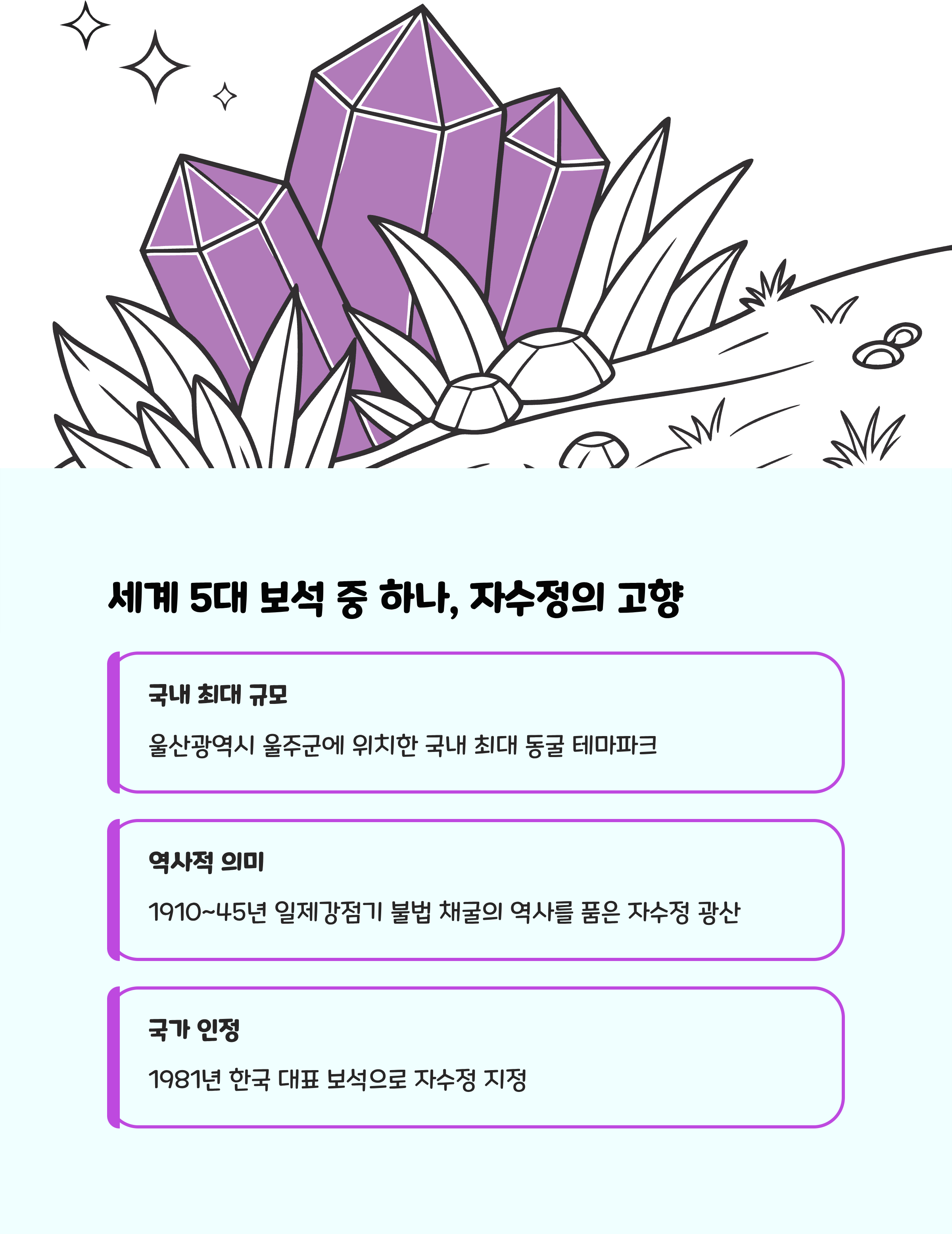 위 내용은 울산문화관광정보와 울산역사문화대전, 그리고 자수정동굴나라 공식 홈페이지를 참고하여 작성하였으며, 최신 관광정보와 역사적 배경을 종합적으로 반영하였습니다.