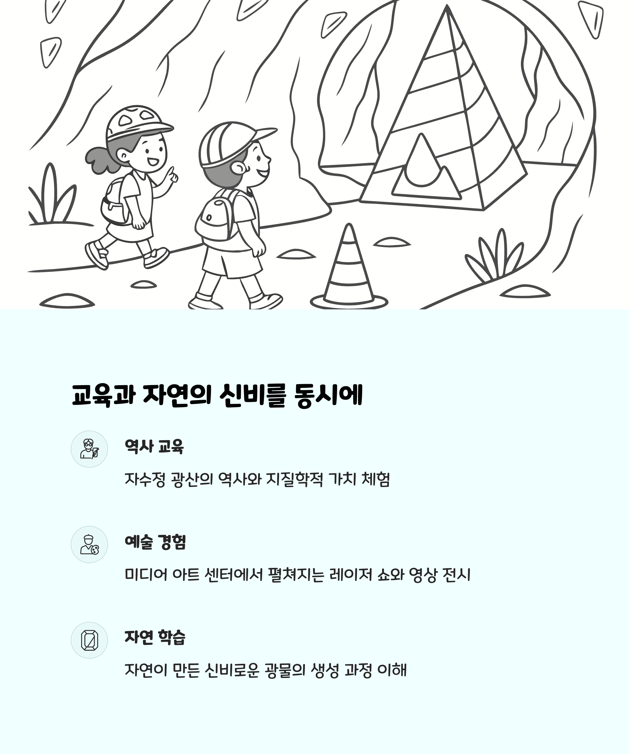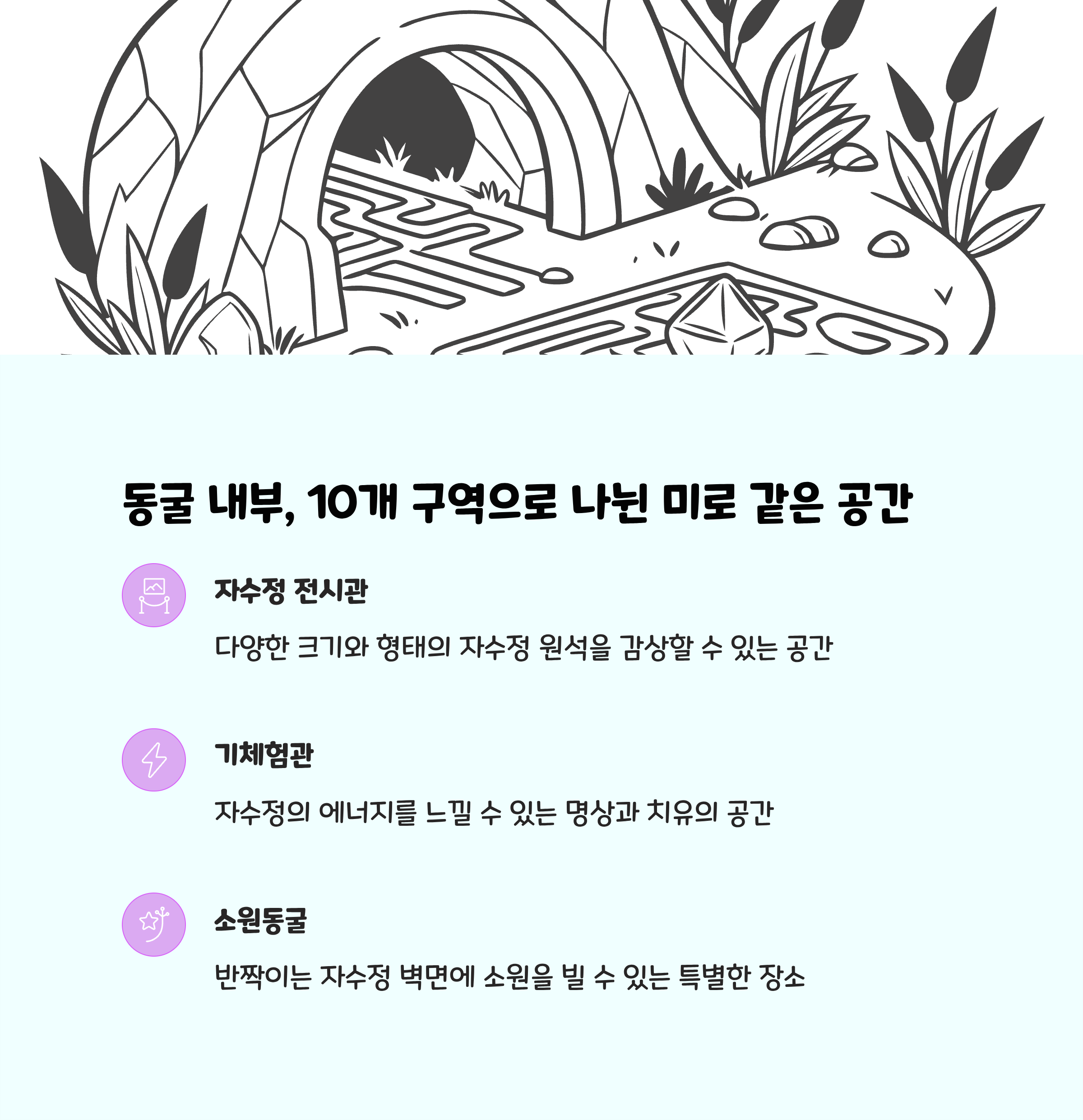 자수정 전시관, 기(氣) 체험관, 소원 동굴, 원주민 생활관, 동굴 미디어 영상관 등 다양한 테마 공간이 마련되어 있어 볼거리가 풍부합니다.