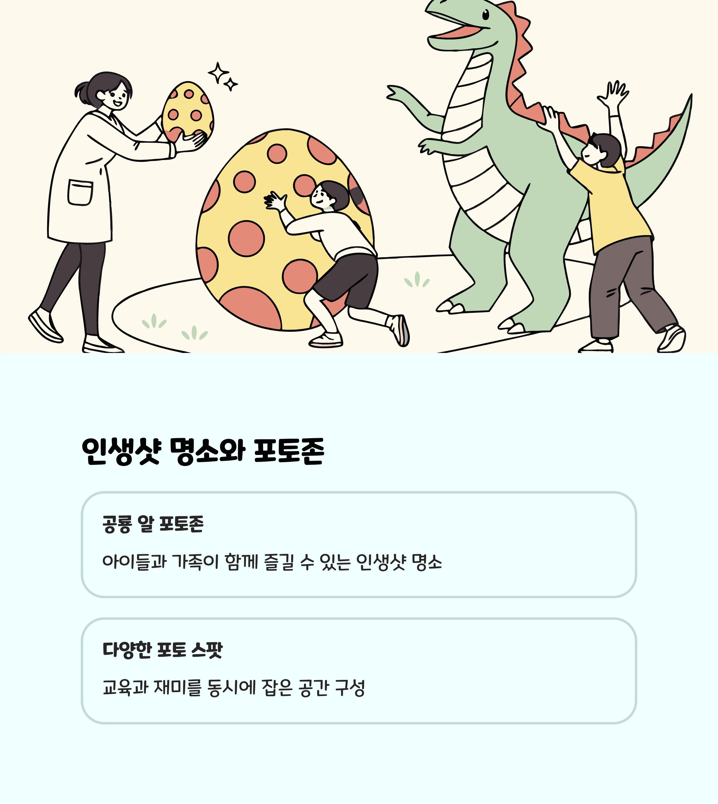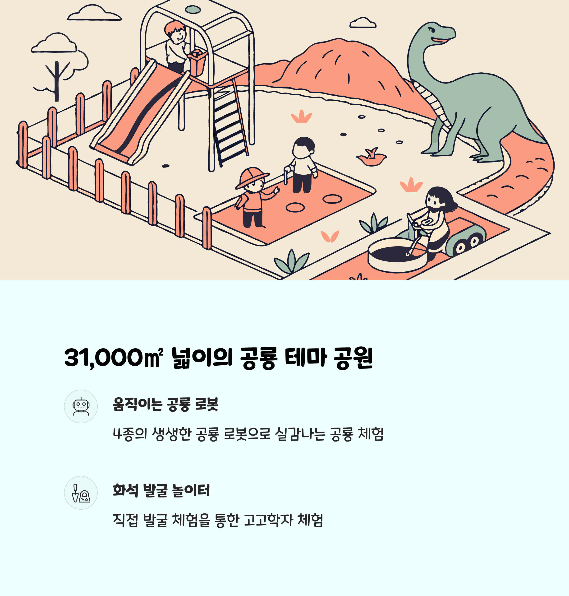 | 주요 시설 | 공룡 로봇 4종, 화석 발굴 놀이터, 공룡 알 포토존, 산책로, 쉼터 |